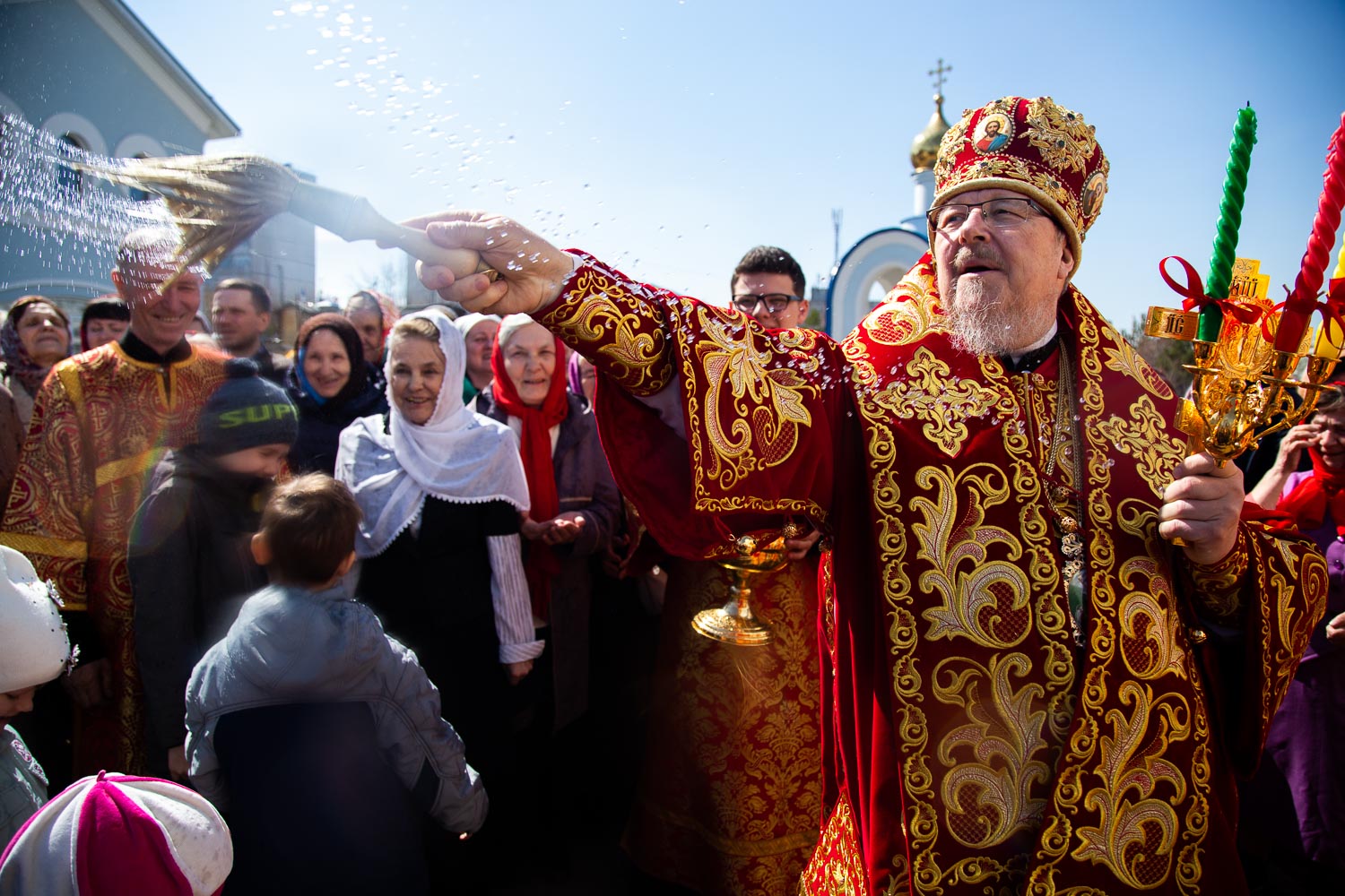 По окончании Божественной литургии правящий архиерей возглавил крестный ход вокруг собора и поздравил верующих ачинцев с Пасхой Христовой: