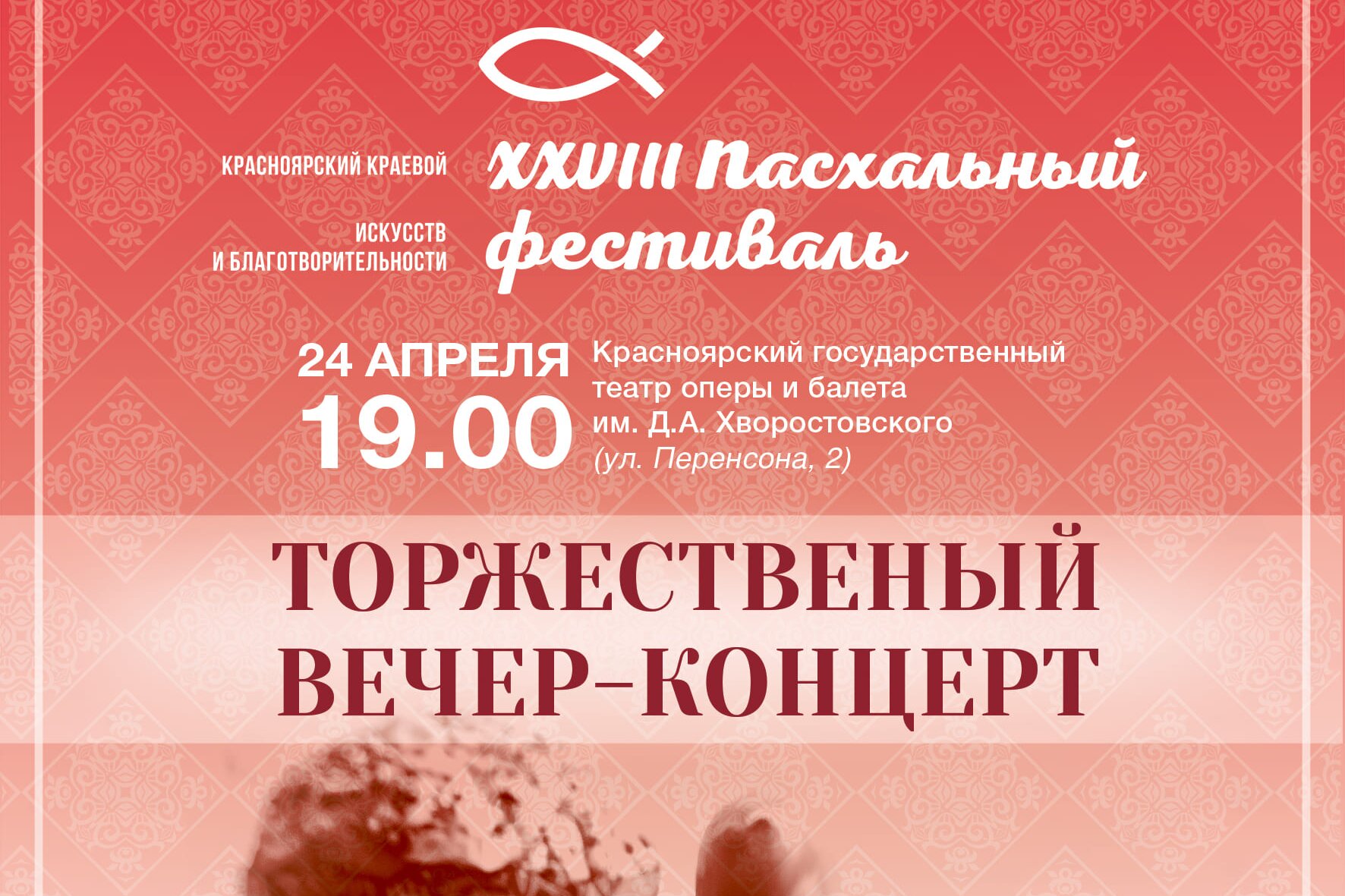 24 апреля в 19:00 в Красноярском государственном театре оперы и балета им. Д.А. Хворостовского (ул. Перенсона, 2) состоится вечер-концерт, посвященный XXVIII Красноярскому краевому Пасхальному фестивалю искусств и благотворительности.
