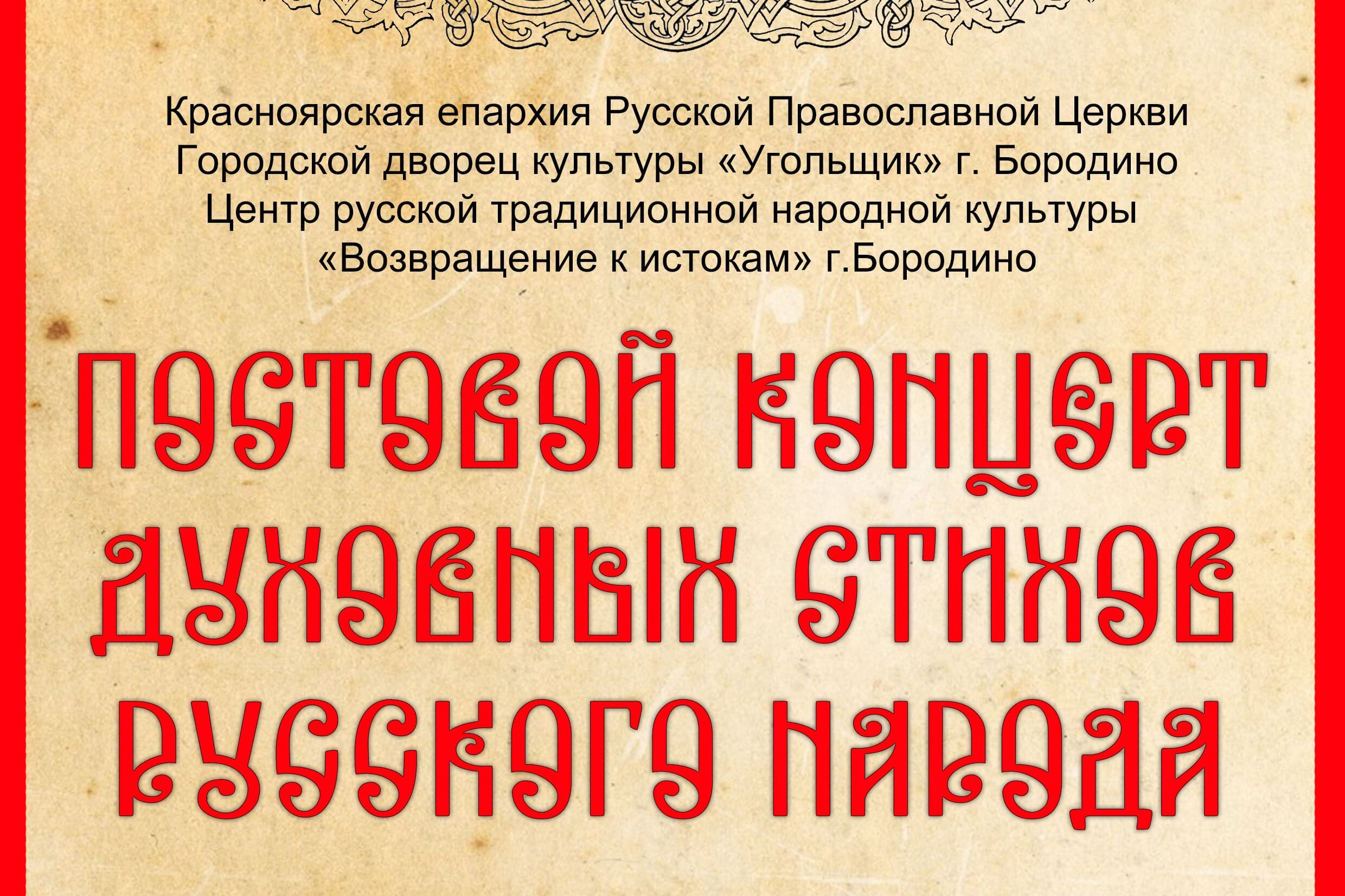 23 марта в Конференц-зале Архиерейского дома города Красноярска состоится концерт духовных стихов русского народа. В концерте участвуют солисты и ансамбли из города Бородино.