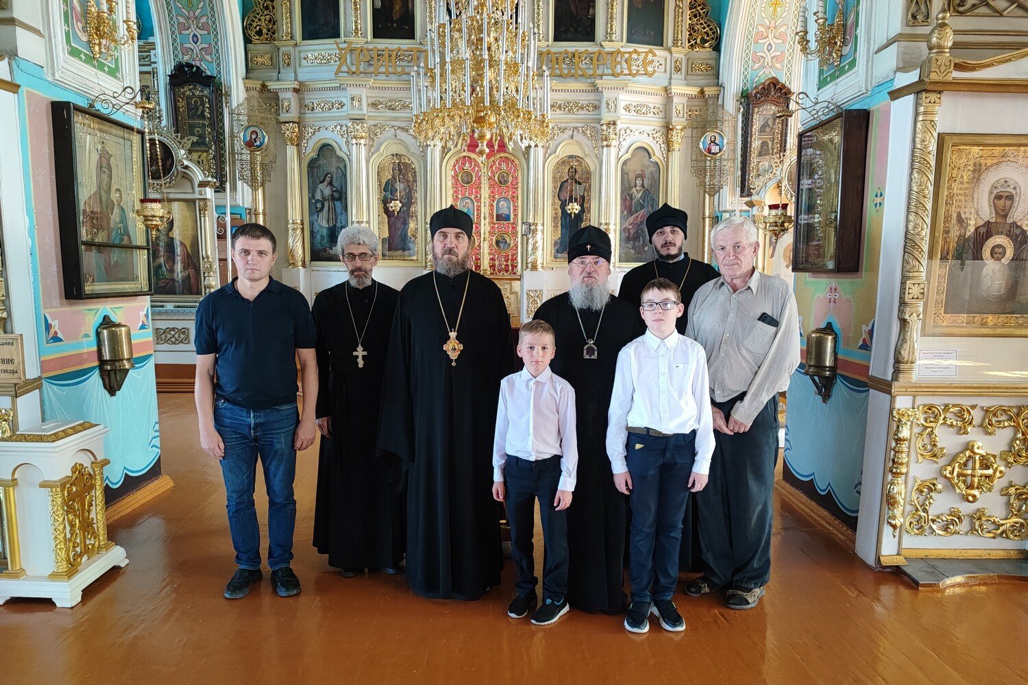 Его Высокопреосвященство сопровождали: секретарь епархиального управления Минусинской епархии, клирик Спасского собора города Минусинска диакон Матфей Фокша; благочинный Минусинского церковного округа, клирик Спасского собора города Минусинска иерей Сергий Круглов; протоиерей Максим Немыченков и секретарь-референт главы Красноярской митрополии Владимир Лужков.