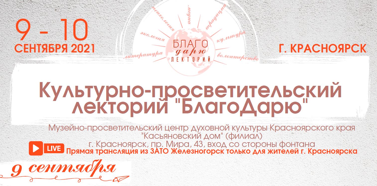 9–10 сентября в городе Железногорске стартует культурно-просветительский лекторий «БлагоДарю». Встречи в рамках лектория пройдут в помещении Центральной городской библиотеки имени Максима Горького (г. Железногорск, ул. Крупской, дом 8).