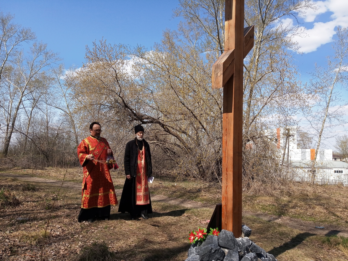 11 мая штатные священнослужители ачинского Казанского собора — протоиерей Сергий Пигасов и протодиакон Виталий Каменюк — совершили литию у поклонного креста на старом городском кладбище.