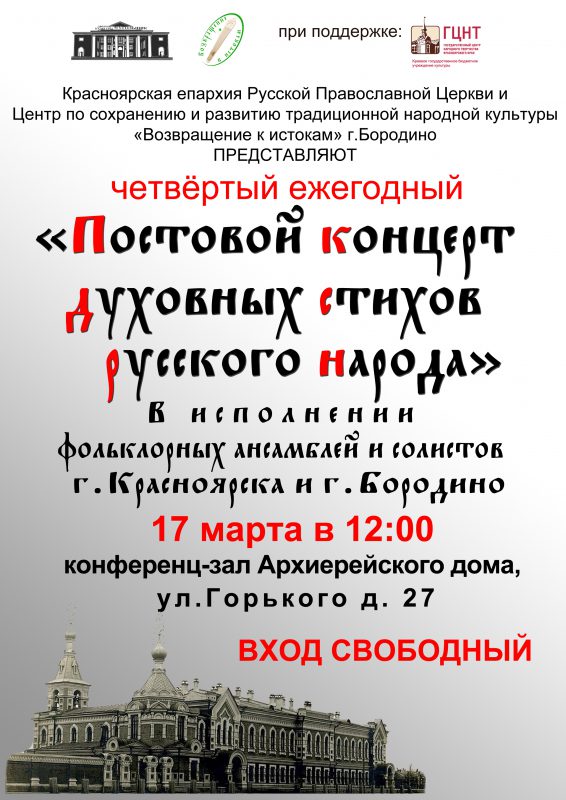 17 марта в конференц-зале Архиерейского дома города Красноярска (ул. Горького, 27), пройдет IV ежегодный «Постовой концерт духовных стихов русского народа».