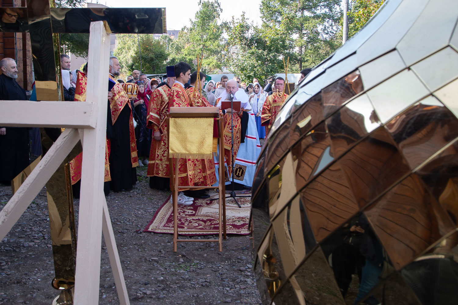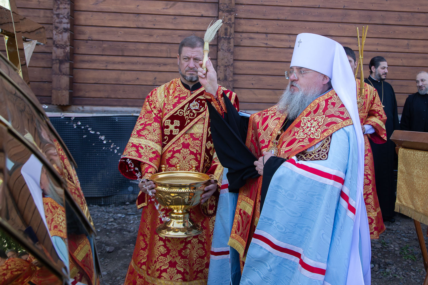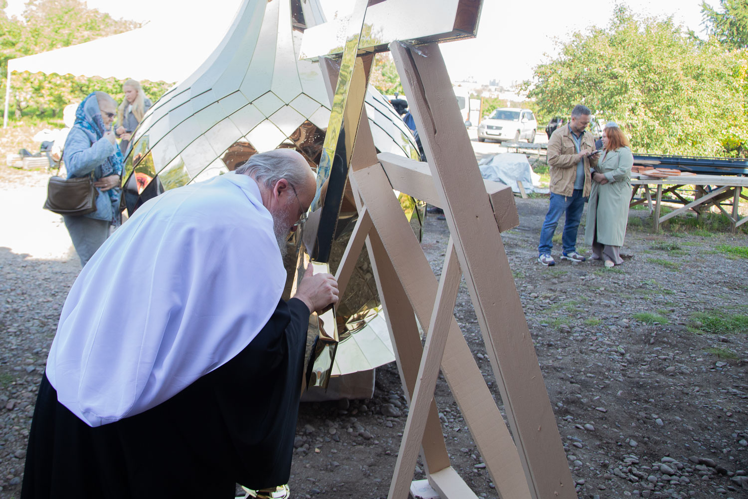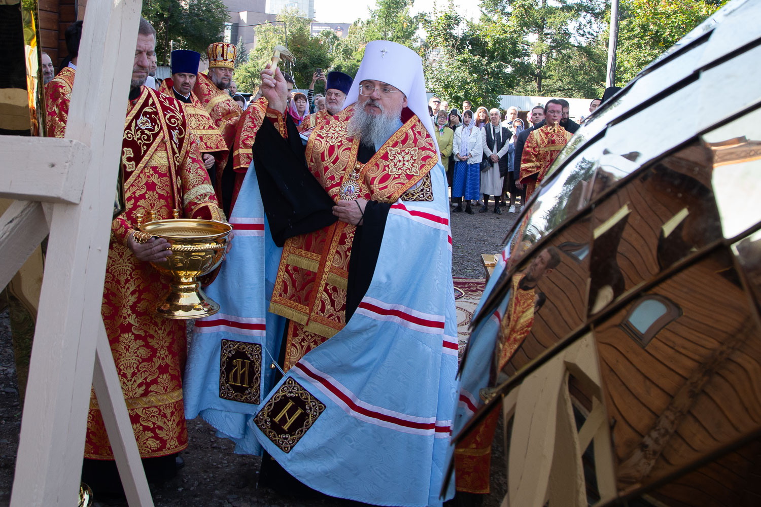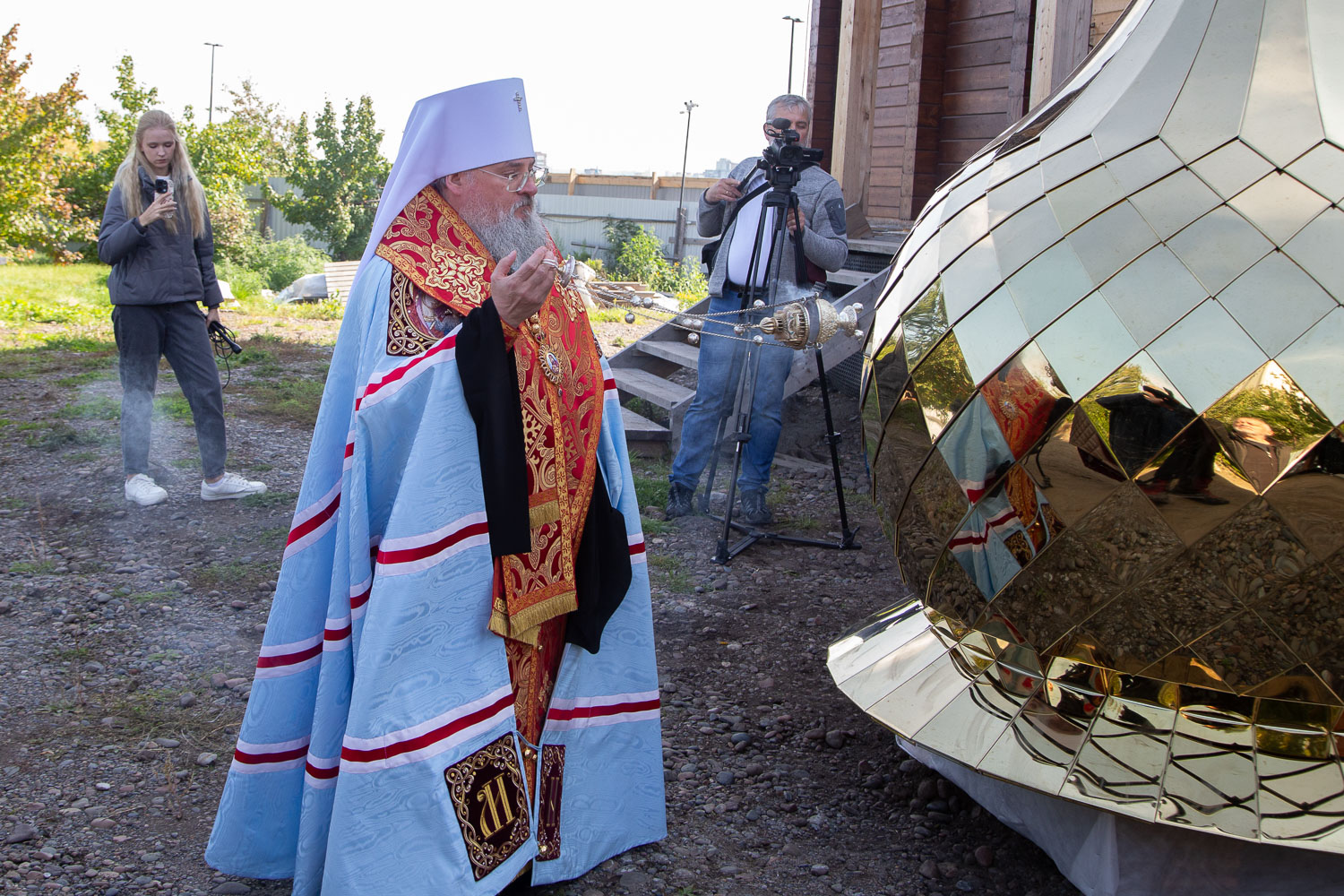 11 сентября на территории строящегося храма Иоакима и Анны на Стрелке митрополит Красноярский и Ачинский Никита совершил чин освящения купола и креста.