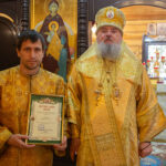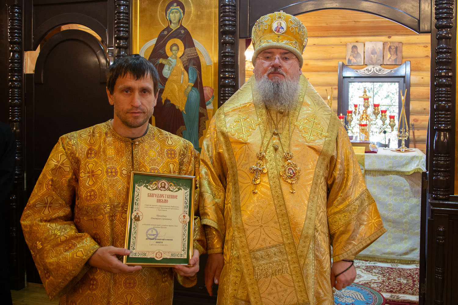 За труд и активное участие в жизни прихода храма священномученика Амфилохия в городе Красноярске правящий архиерей наградил благодарственными письмами: старосту прихода Дмитрия Сергеевича Приходова и певчию Ирину Александровну Евфимову.