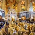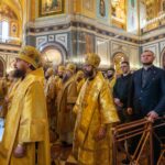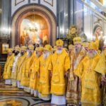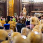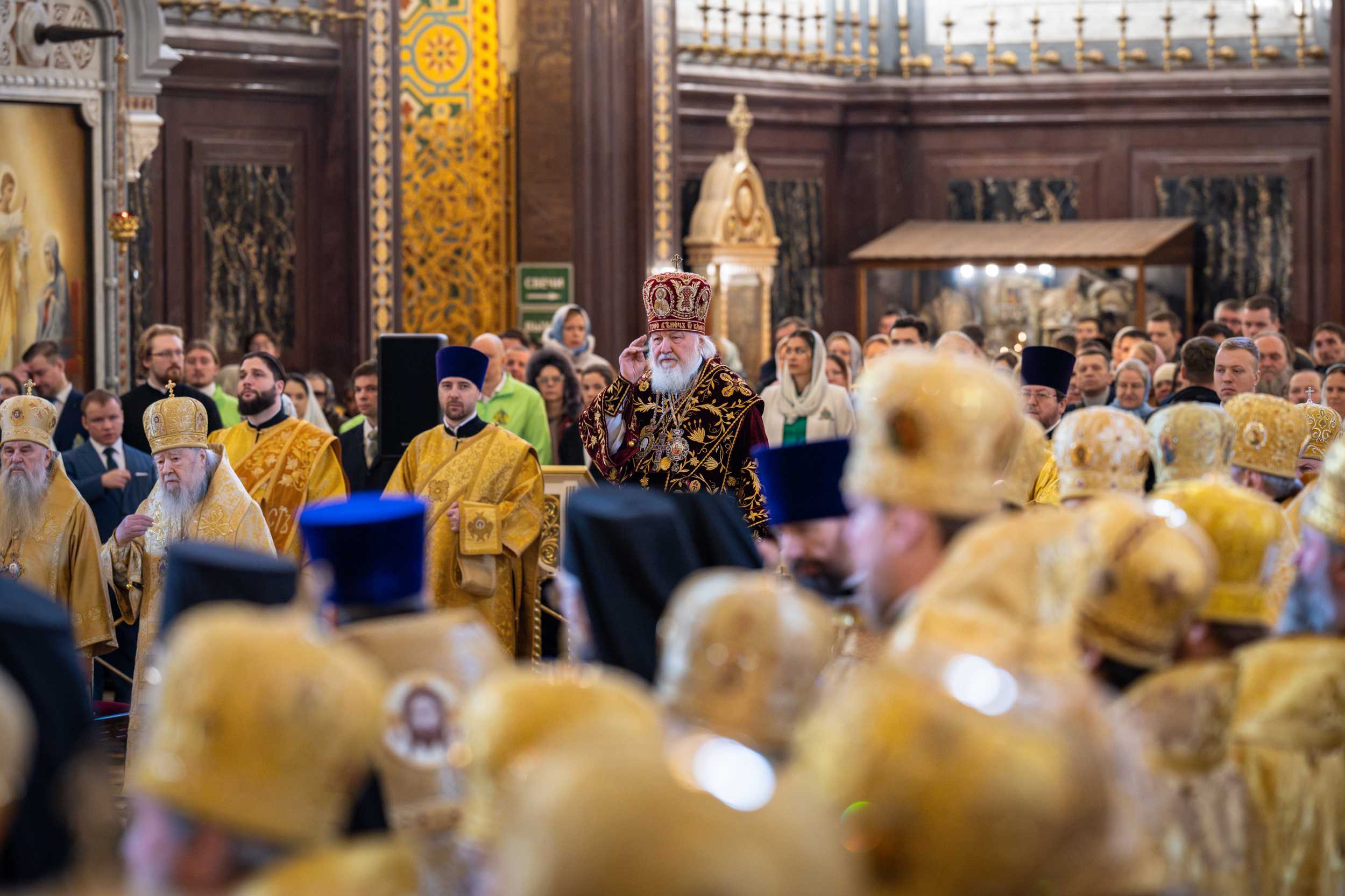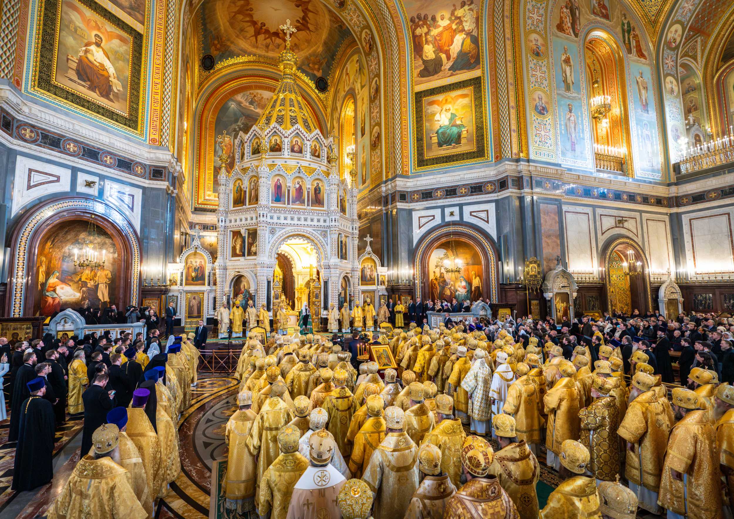 В этот знаменательный день Святейший Патриарх Кирилл совершил Божественную литургию в кафедральном соборном Храме Христа Спасителя в Москве в интронизационных облачениях и с копией жезла святителя Петра.