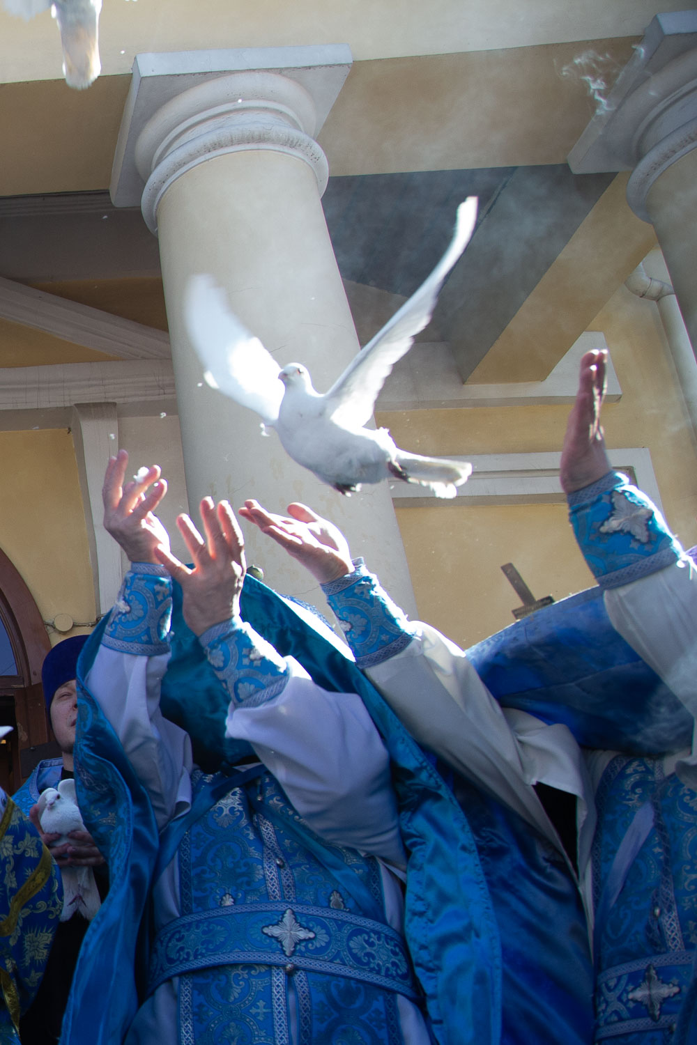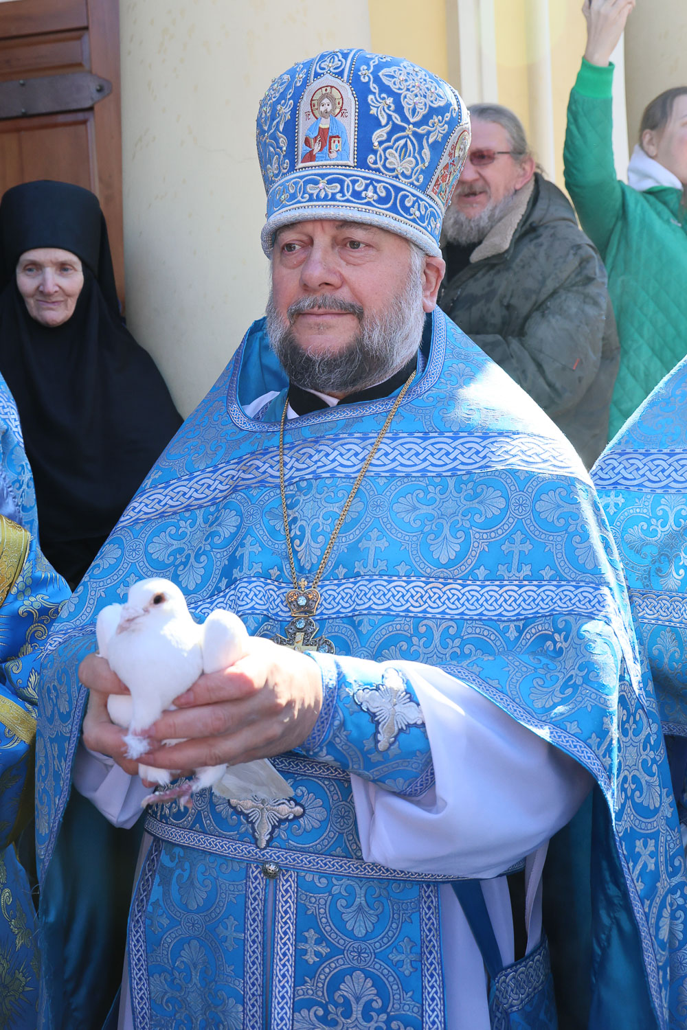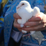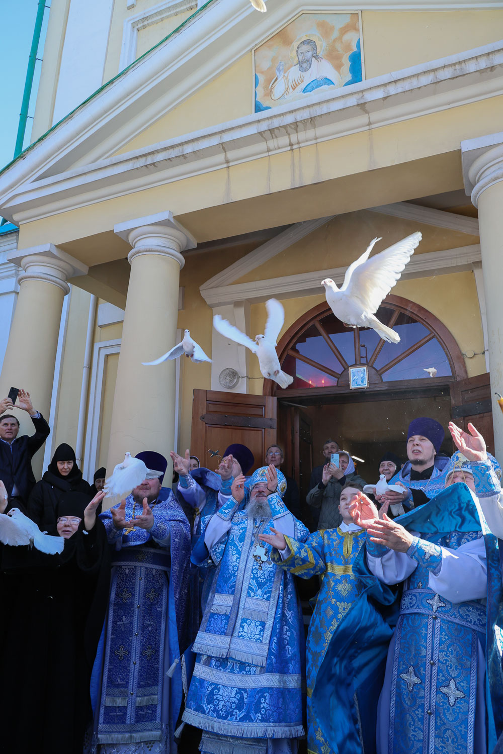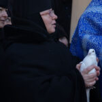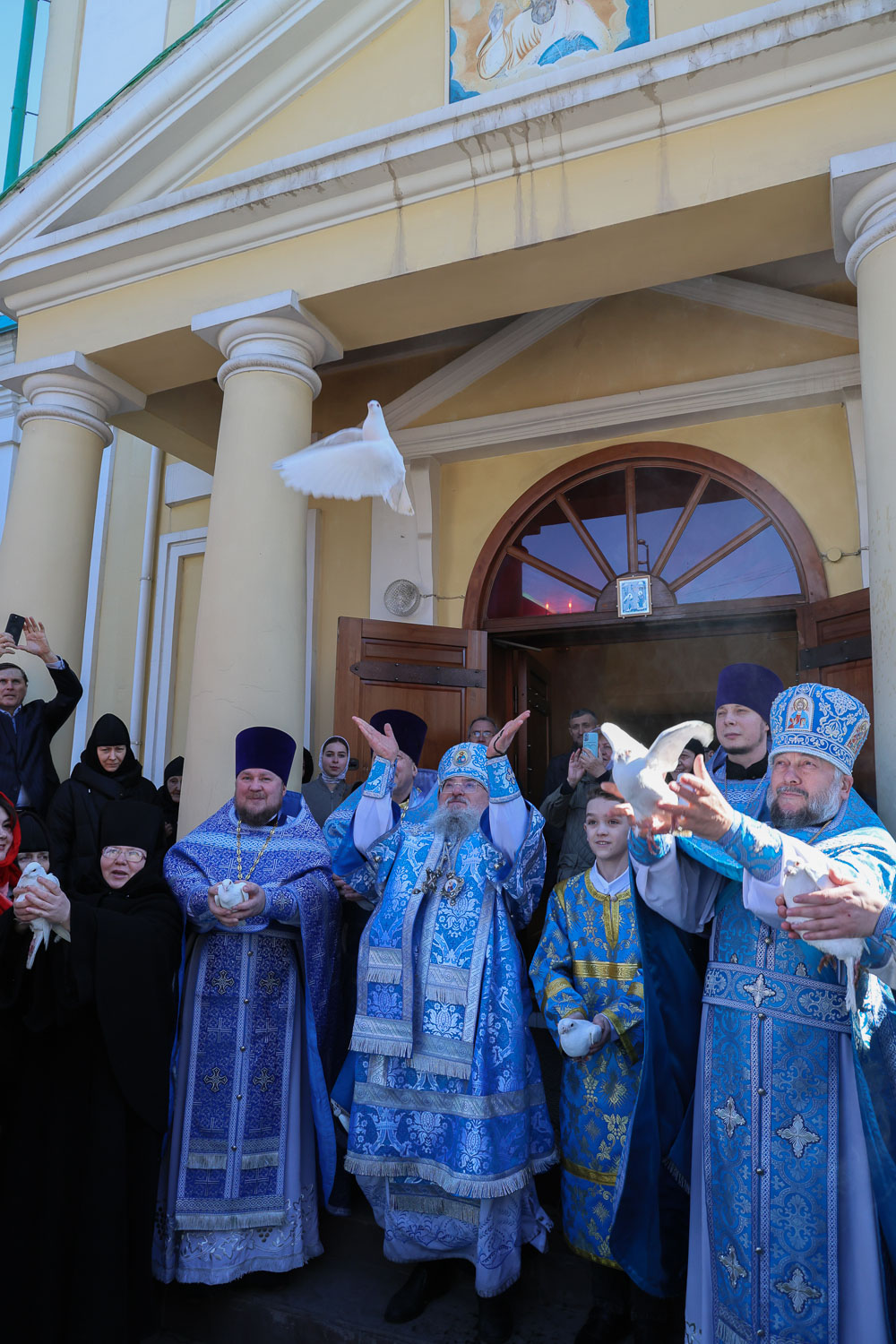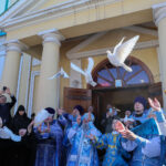 После завершения шествия владыка Никита, игумения, духовенство и дети выпустили в небо белых голубей в честь праздника Благовещения Пресвятой Богородицы.