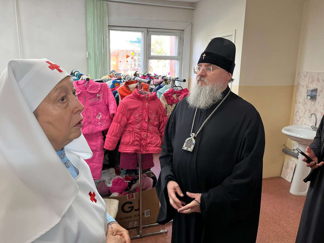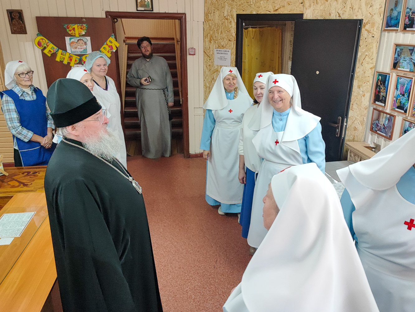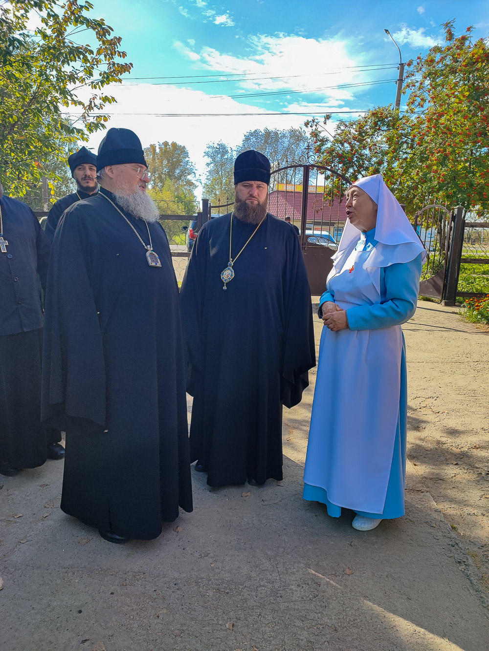 Митрополита Никиту и епископа Игнатия встретили руководитель Социального отдела епархии иерей Фёдор Кононов и старшая сестра милосердия епархиального сестричества Тамара Благирева.