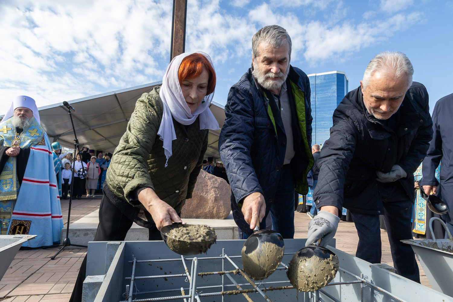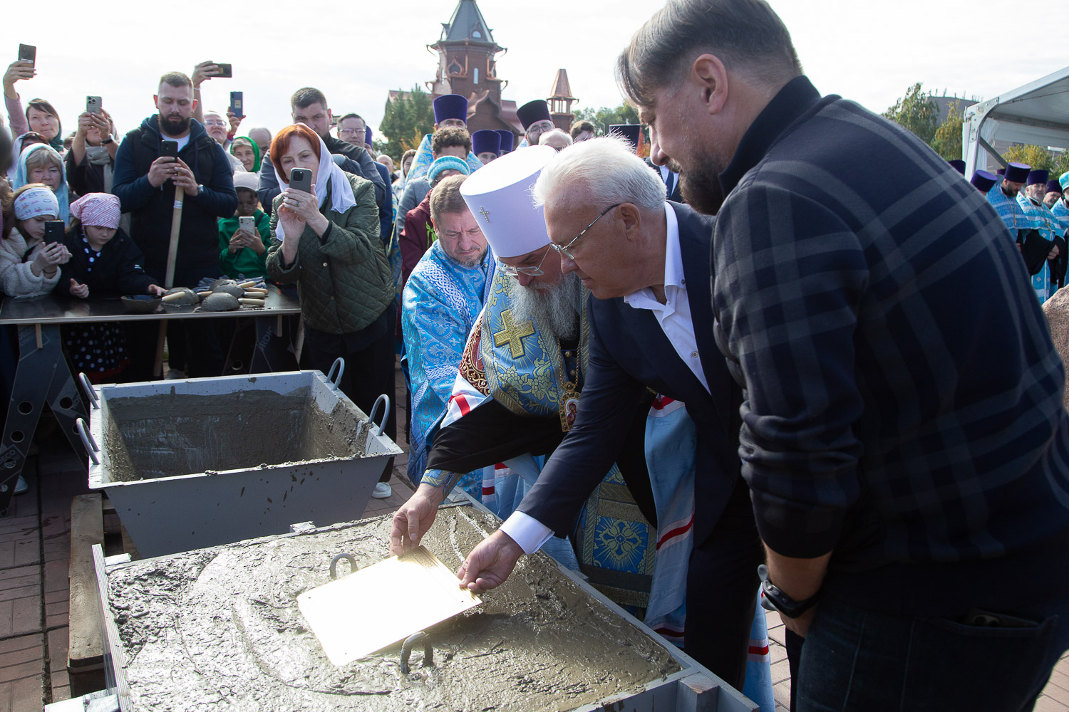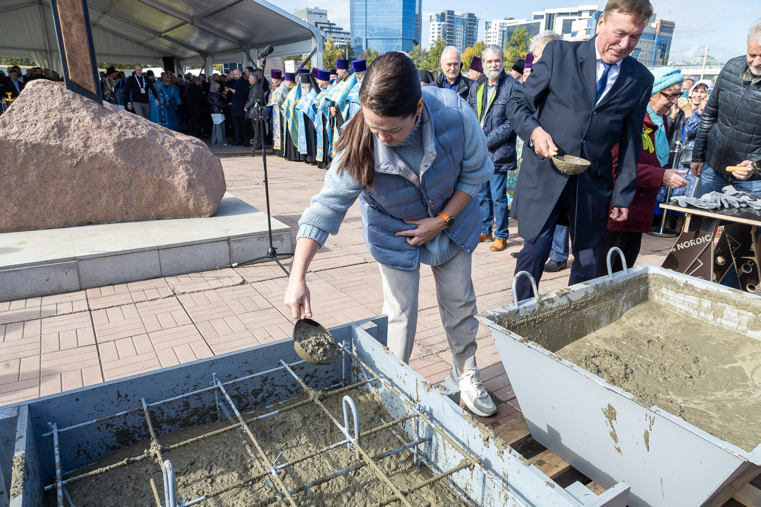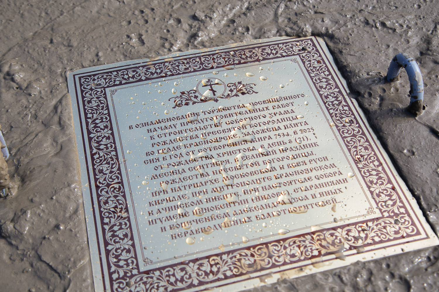 По окончании молебна почетные гости приняли участие в формировании «краеугольного камня», который ляжет в основание фундамента собора в честь Рождества Пресвятой Богородицы. Это плита, в которой будут объединены воедино фрагменты фундаментов разрушенного в 30-е годы кафедрального собора и надвратного храма святых праведных Захарии и Елисаветы «Отца сибирских городов» Енисейска.