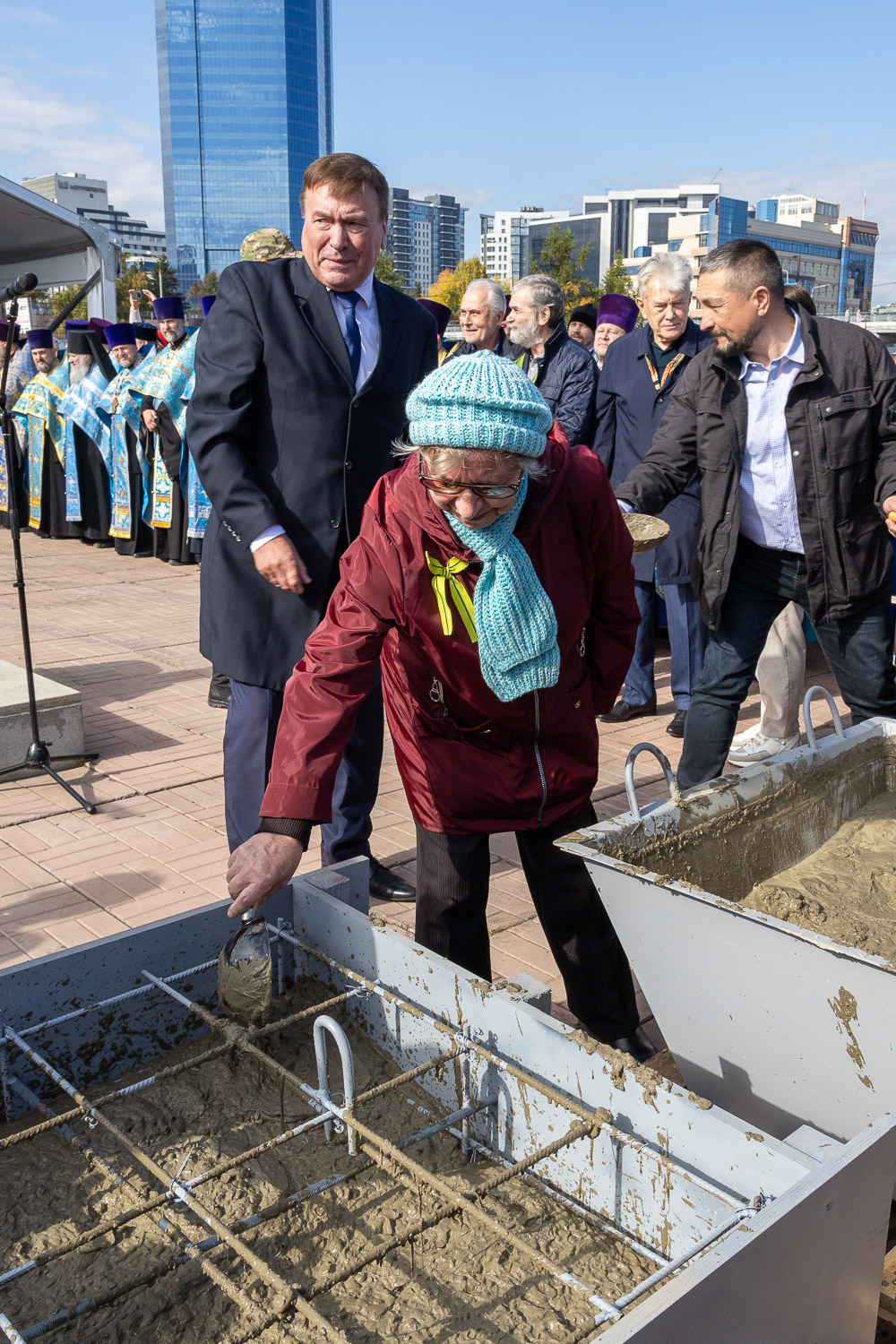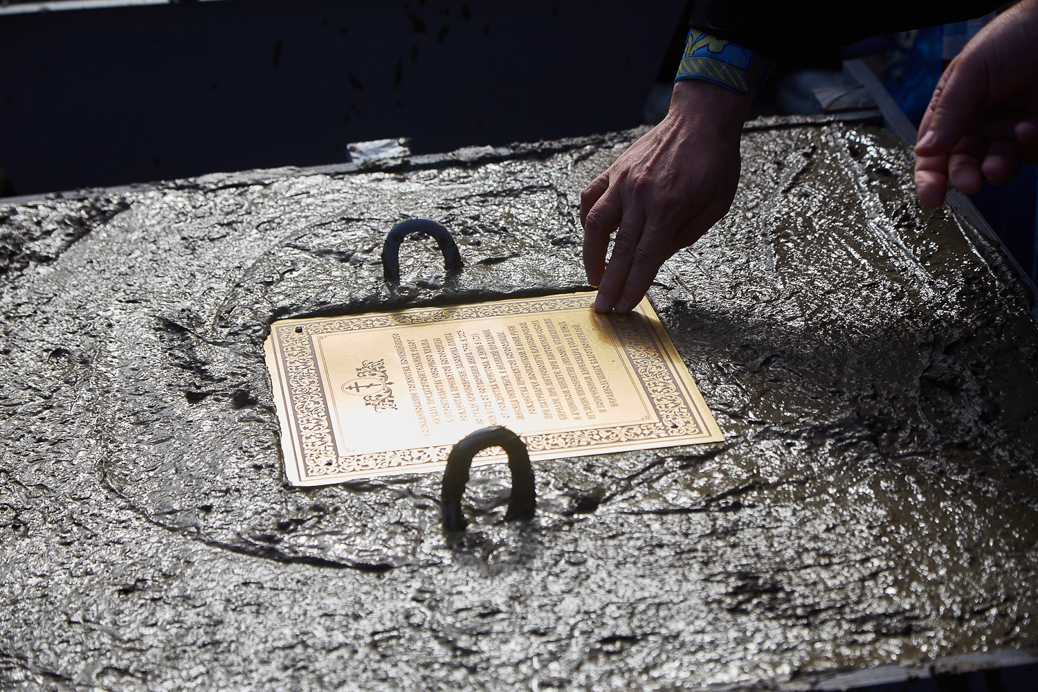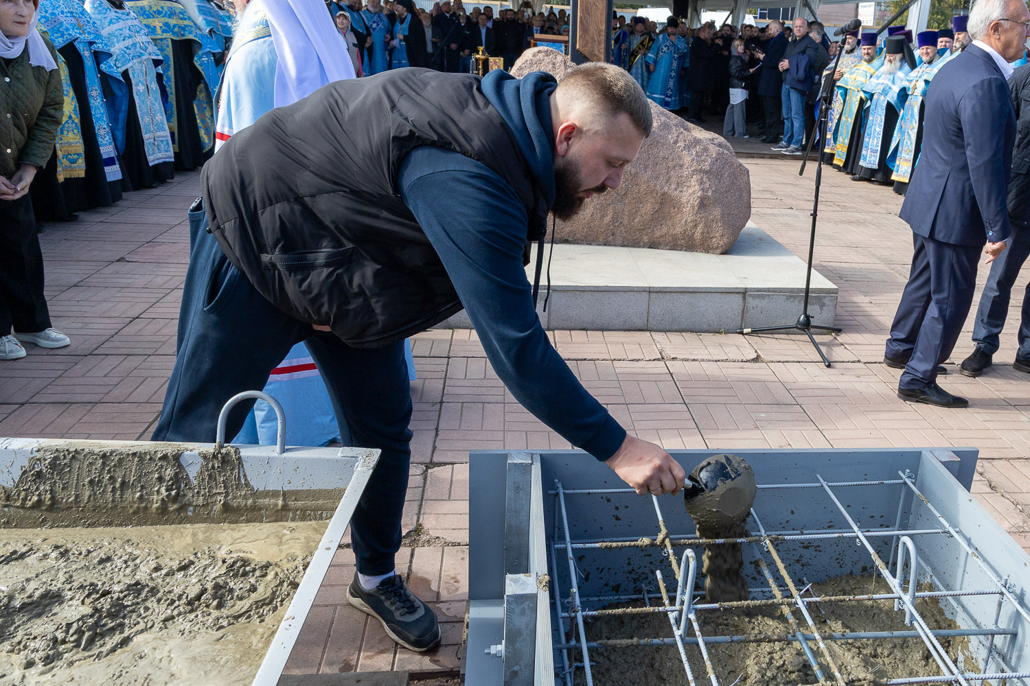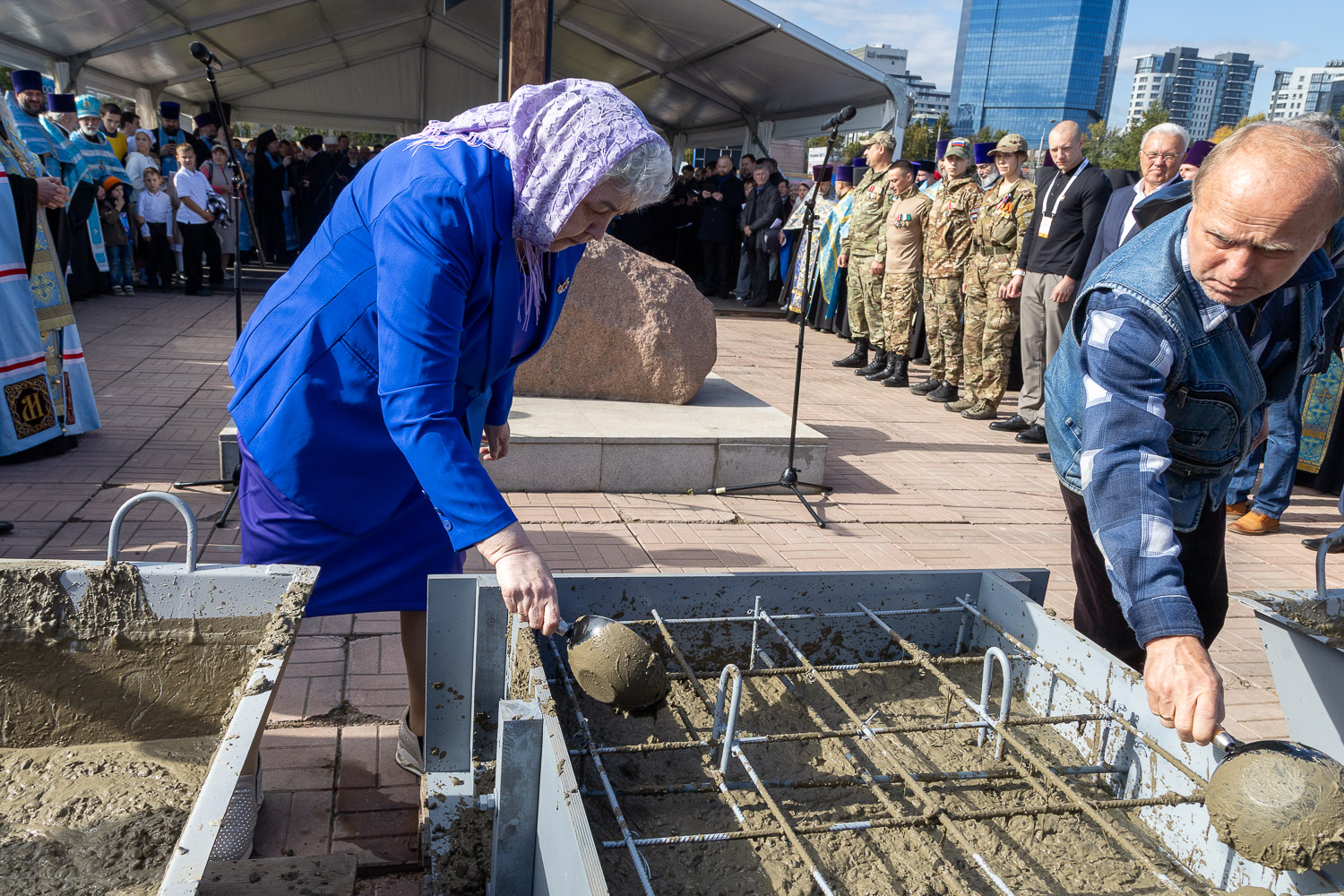 По окончании молебна почетные гости приняли участие в формировании «краеугольного камня», который ляжет в основание фундамента собора в честь Рождества Пресвятой Богородицы. Это плита, в которой будут объединены воедино фрагменты фундаментов разрушенного в 30-е годы кафедрального собора и надвратного храма святых праведных Захарии и Елисаветы «Отца сибирских городов» Енисейска.