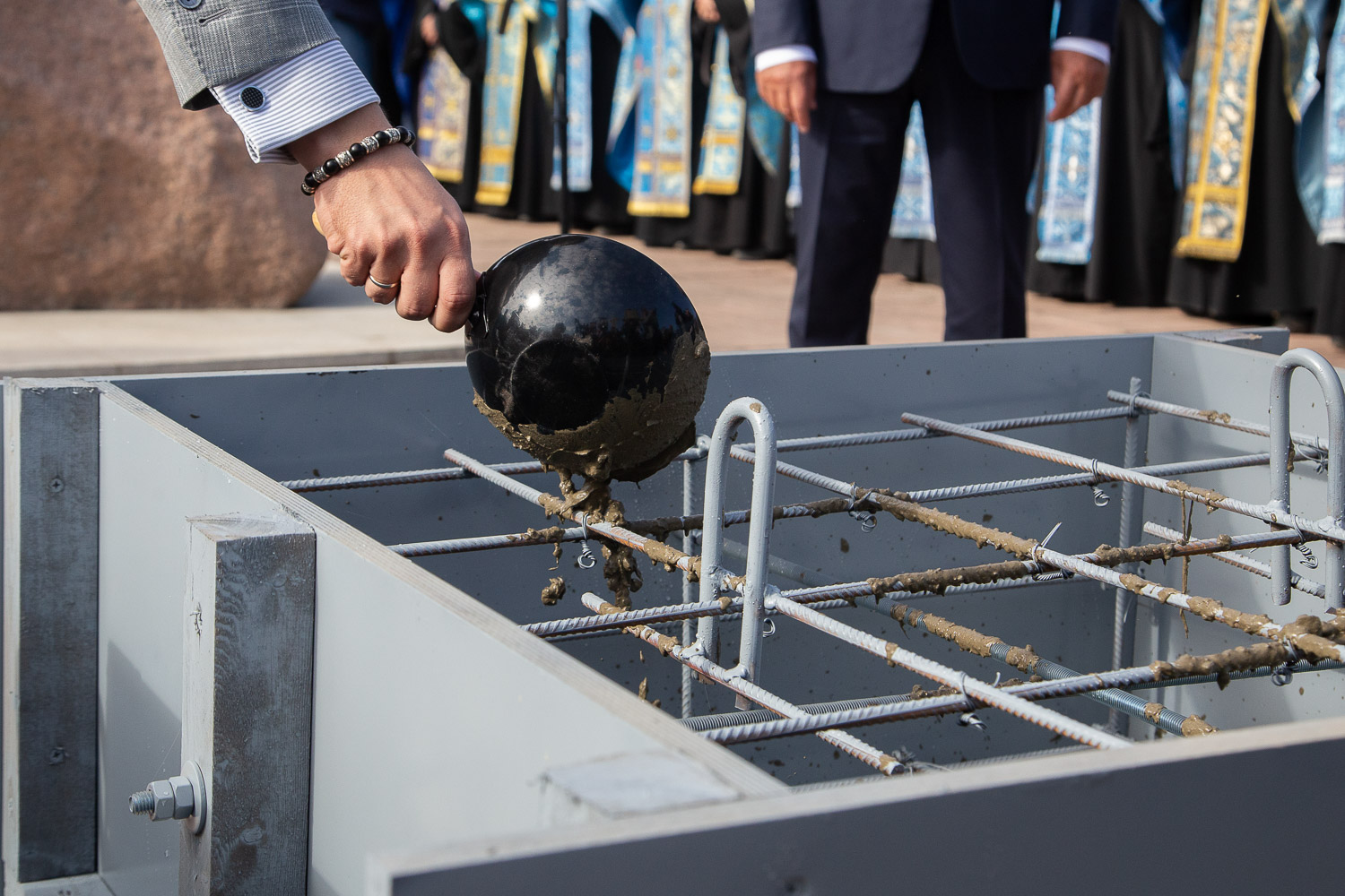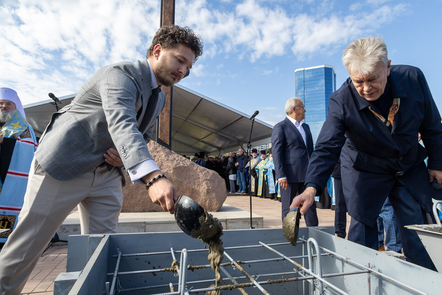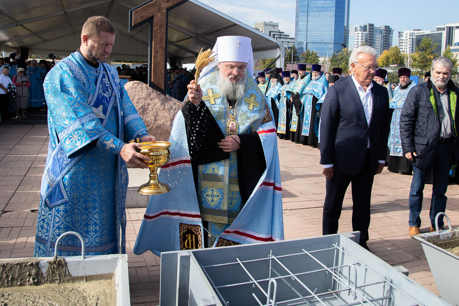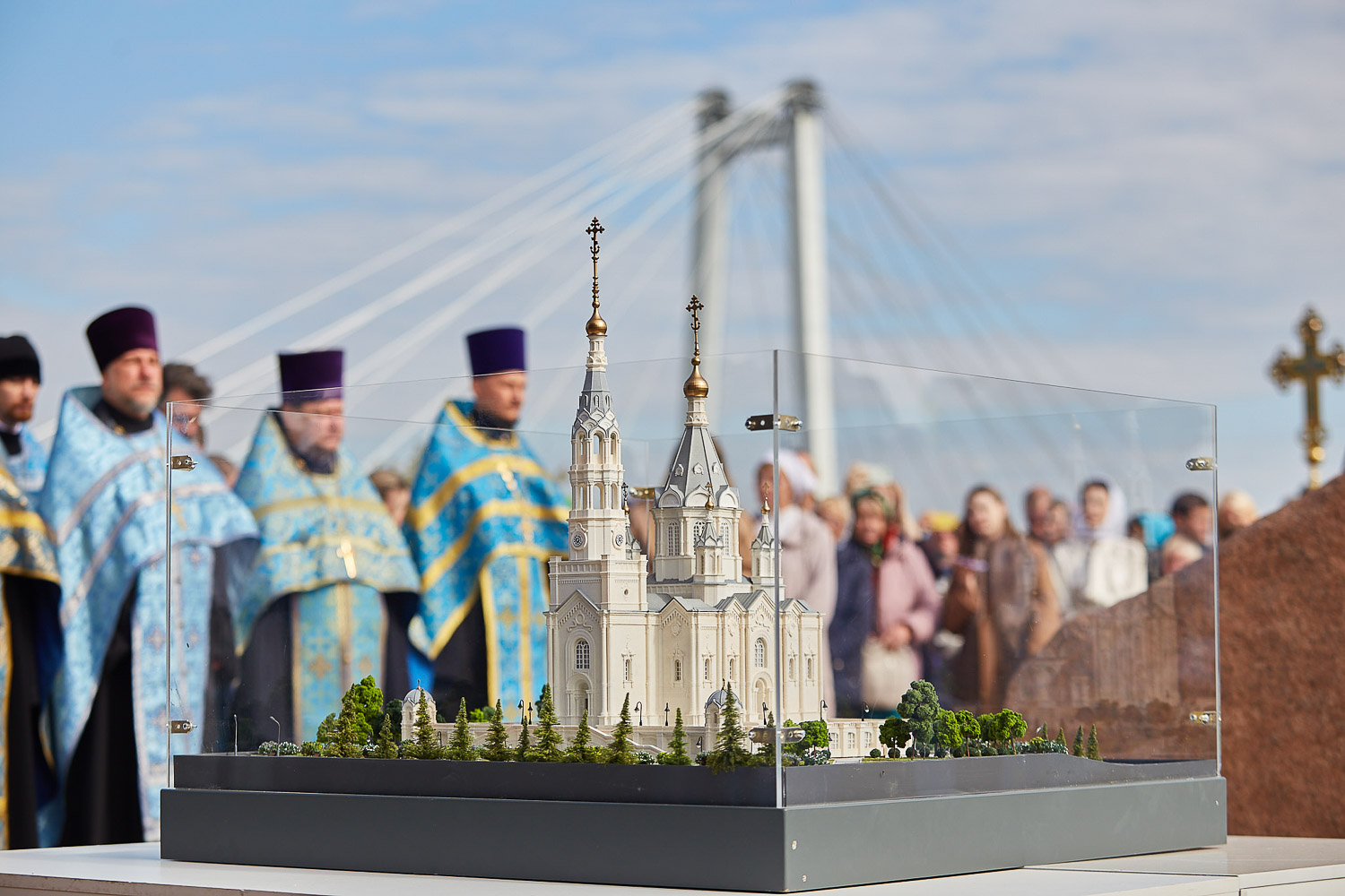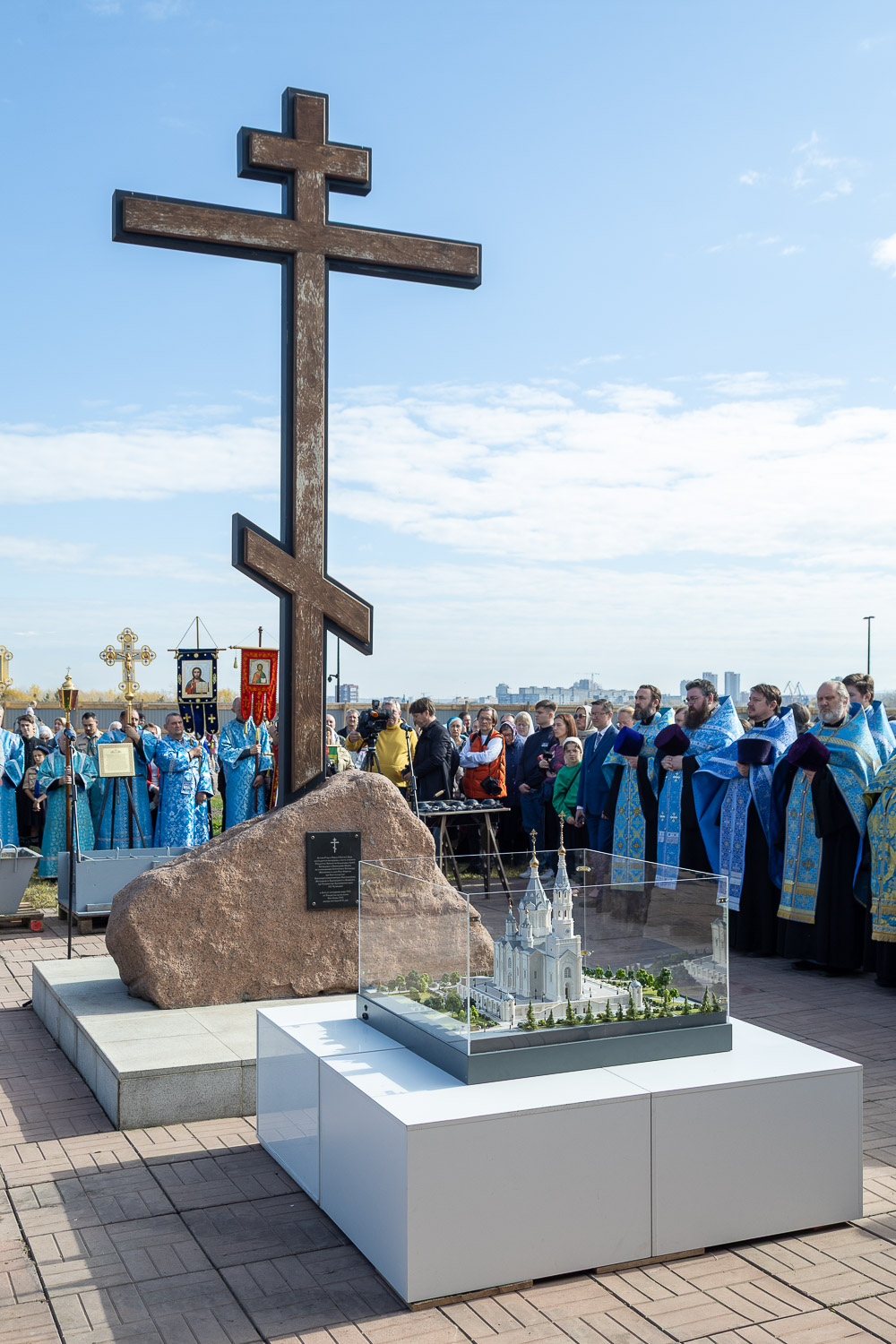 Создание краеугольного камня с праздничным молебном состоялось на Стрелке. Ранее это место выбрал для воссоздания кафедрального собора Святейший Патриарх Московский и всея Руси Кирилл.