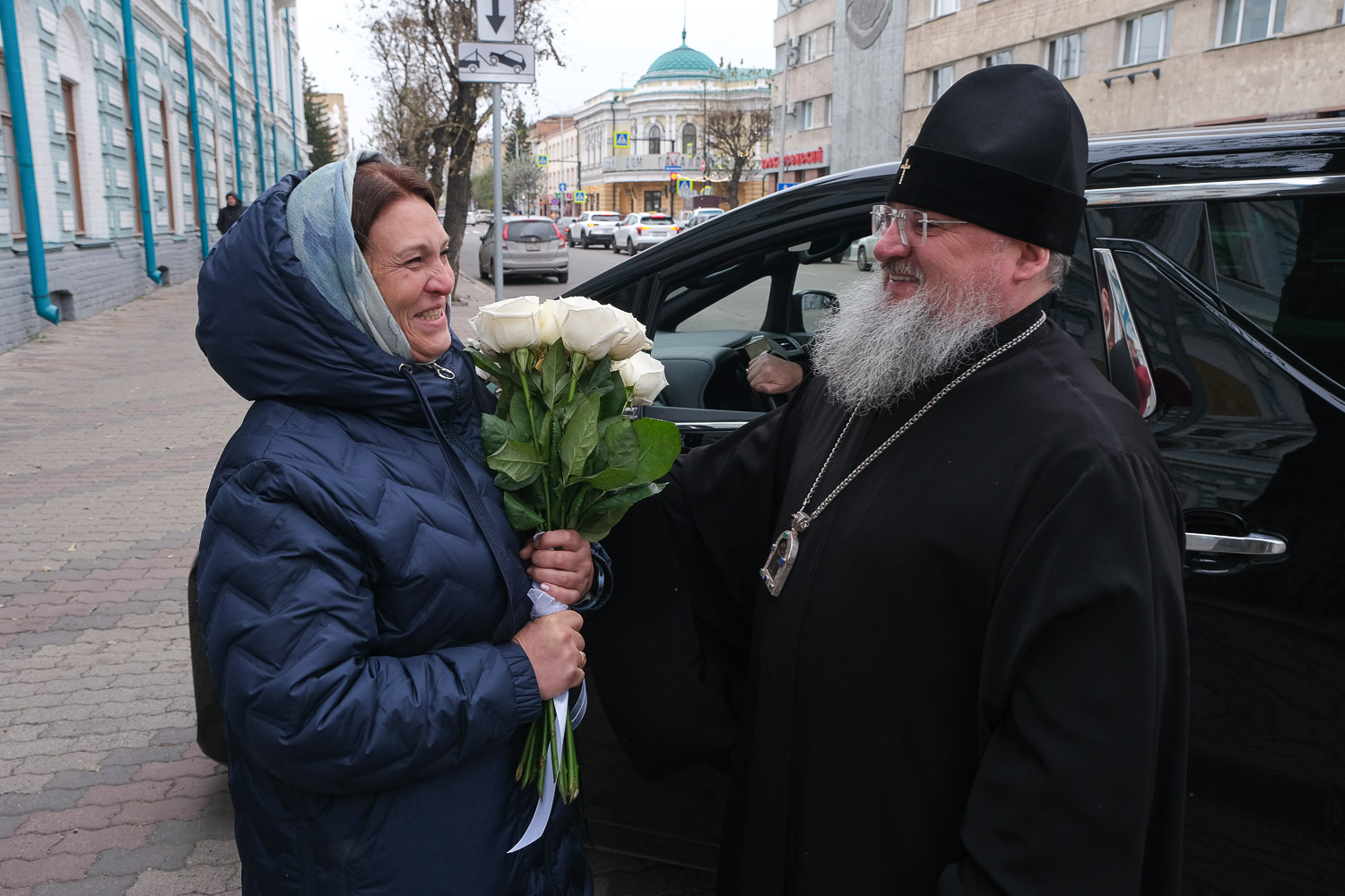Главу Красноярской митрополии встретили ректор КрасГАУ Наталья Ивановна Пыжикова и начальник управления воспитательной работы и молодёжной политики униерситета Татьяна Владимировна Левина.