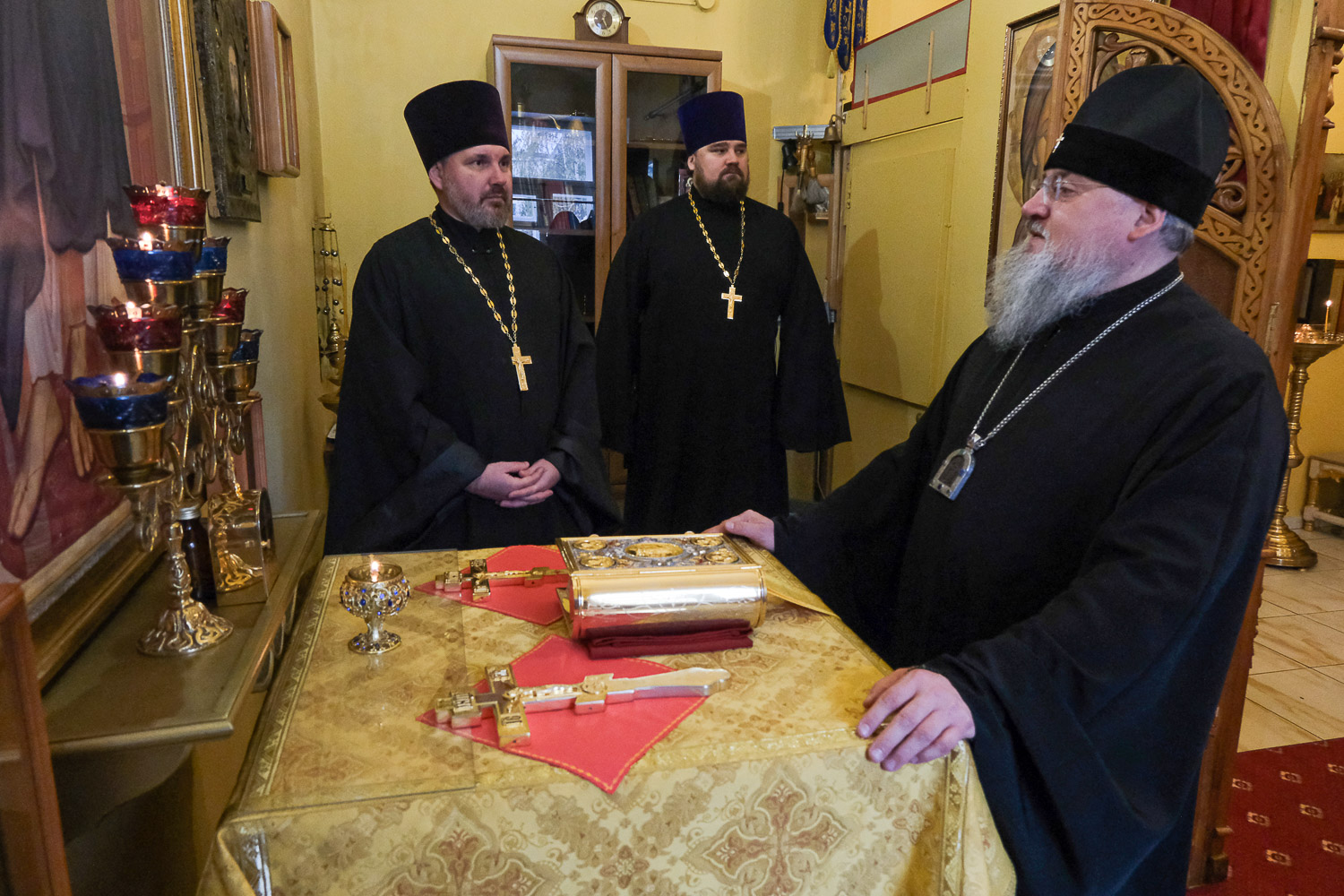 Перед встречей со студентами управляющий Красноярской епархией посетил храм святой мученицы Татианы при университете. Владыка Никита пообщался с настоятелем иереем Антонием Гармановым, осмотрел храм и поклонился святыням.