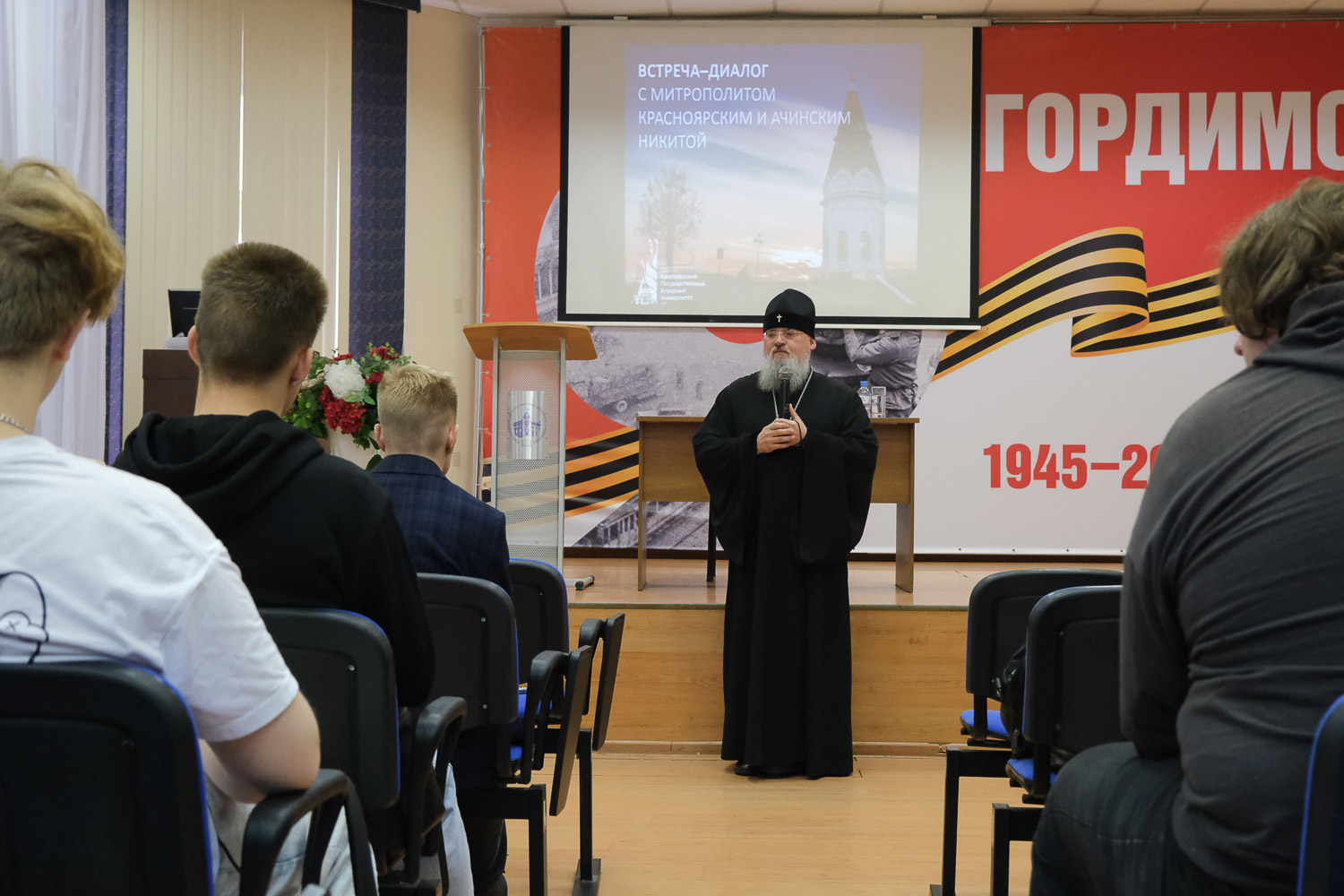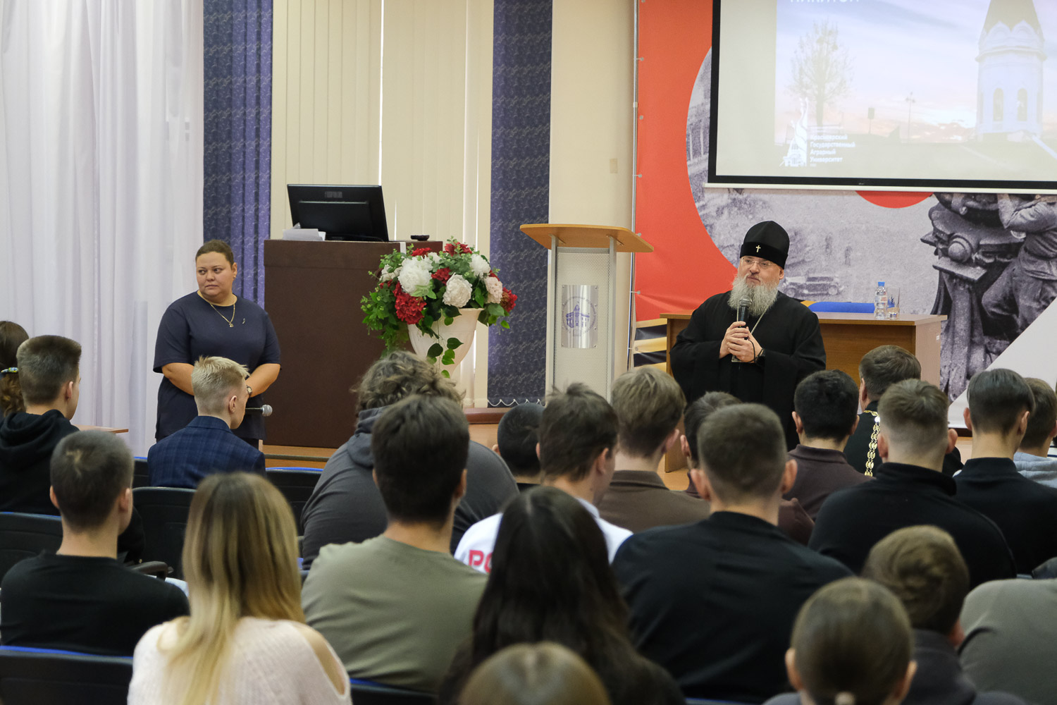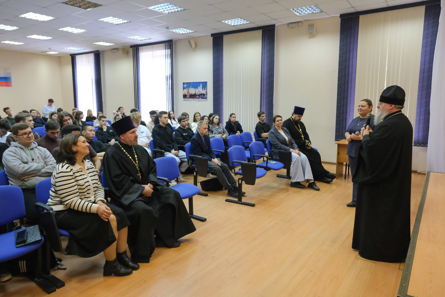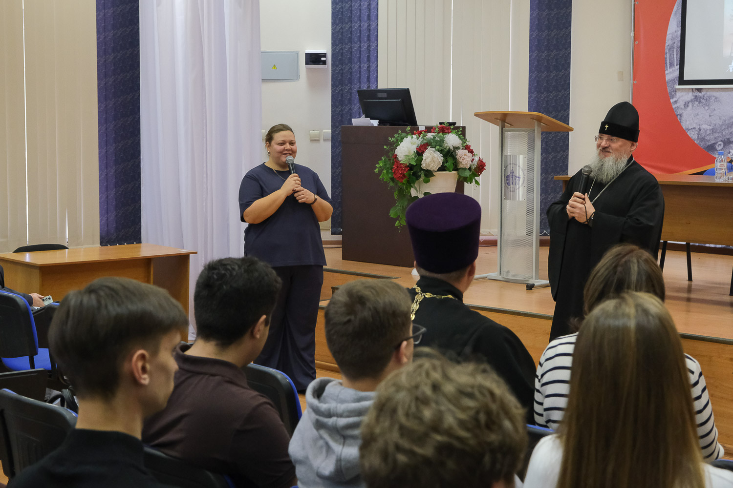 Далее состоялась встреча-диалог со студентами, которую вела начальник отдела молодёжной политики университета Валентина Сергеевна Веселкова. В начале встречи Владыка Никита обратился к студентам со словами: