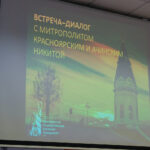 Затем состоялась беседа митрополита Никиты с ректором КрасГАУ Натальей Ивановной Пыжиковой. Обсуждались работа с молодёжью и сотрудничество Красноярской епархии с университетом.