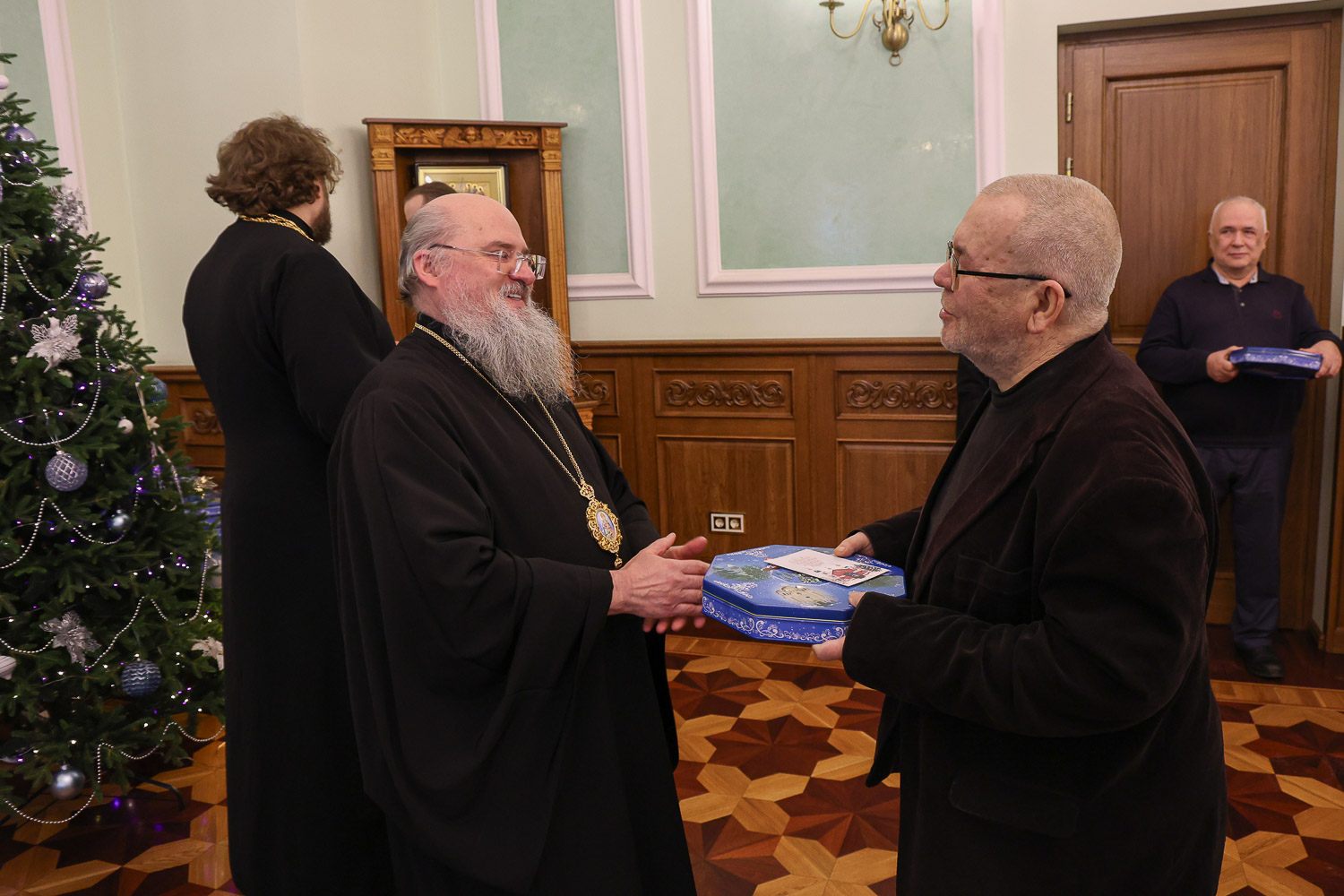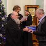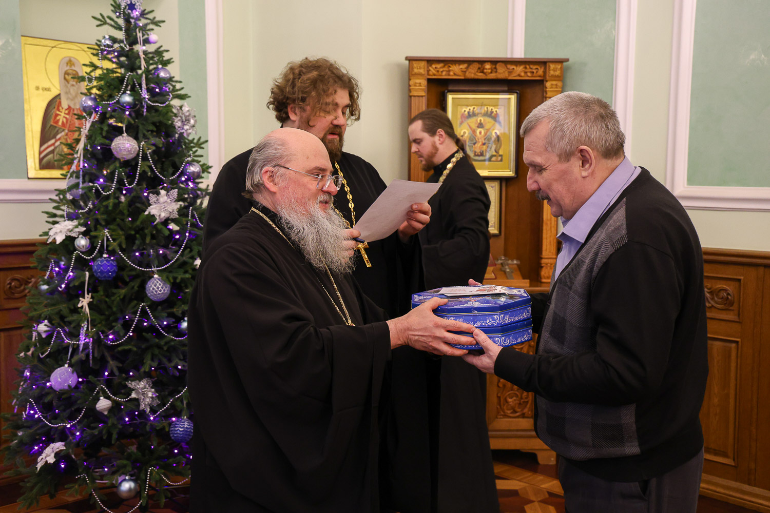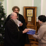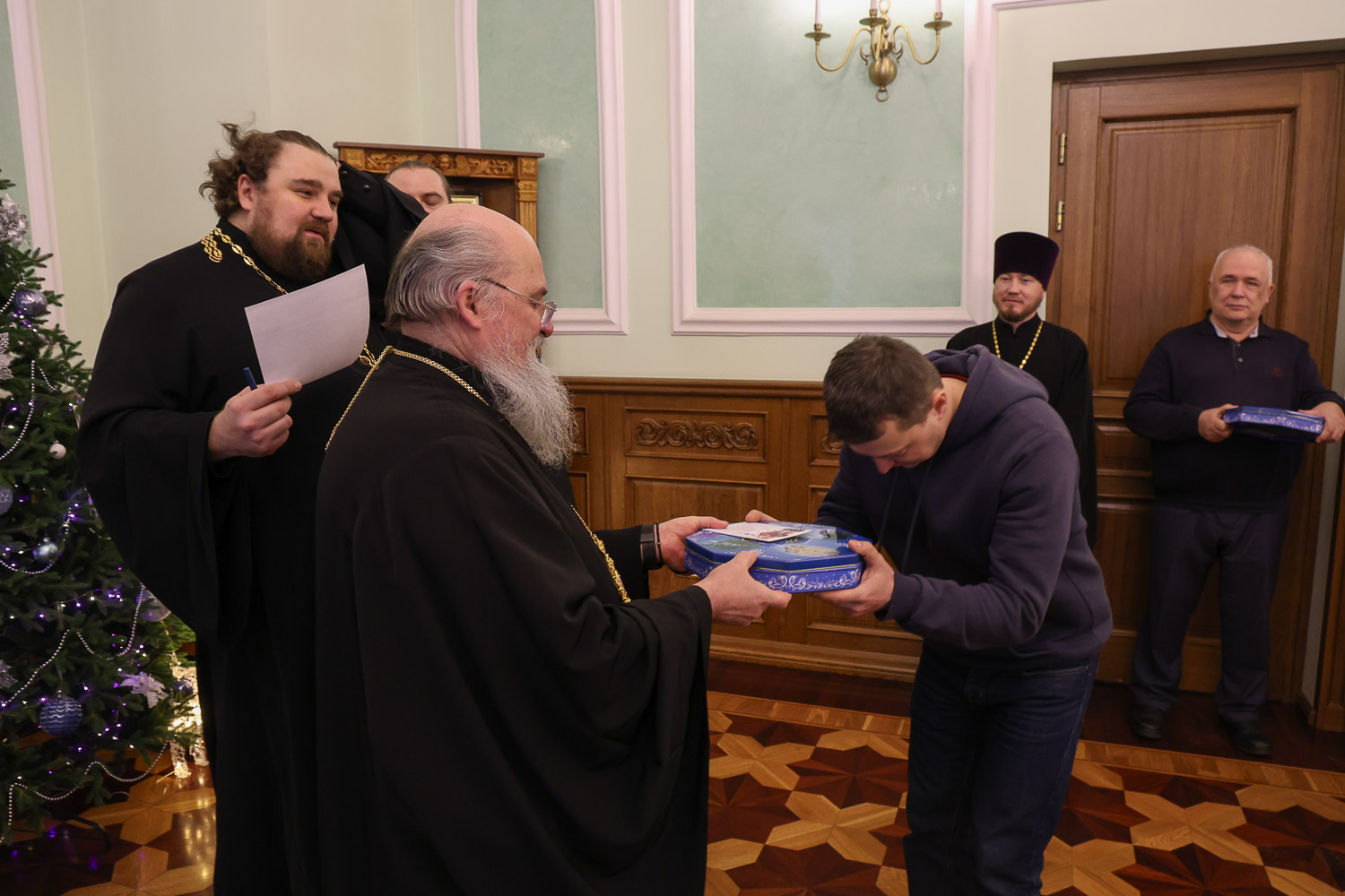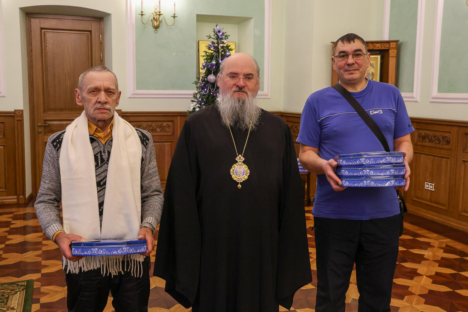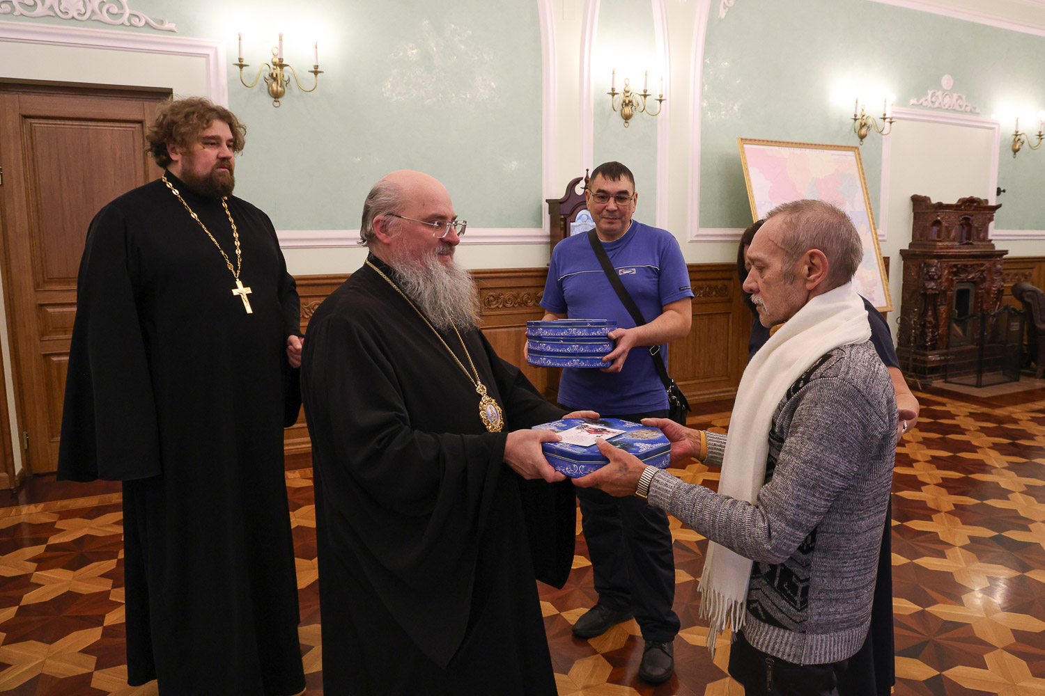 В раздаче подарков Его Высокопреосвященству помогали: заведующий канцелярией Красноярского епархиального управления, личный секретарь-референт главы Красноярской митрополии иерей Владимир Лужков и штатный клирик храма Новомучеников и Исповедников Российских города Красноярска иерей Виктор Носов.
