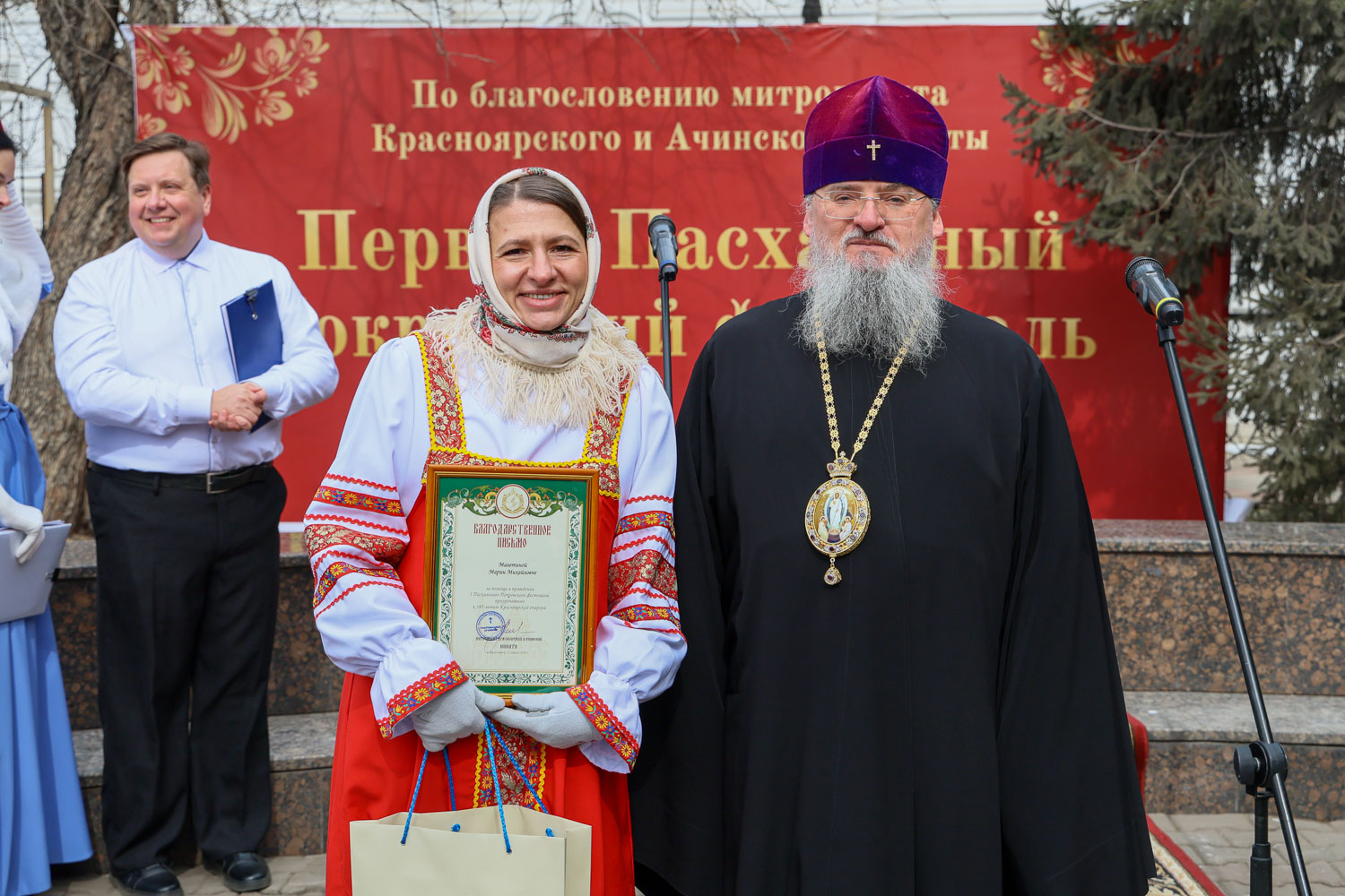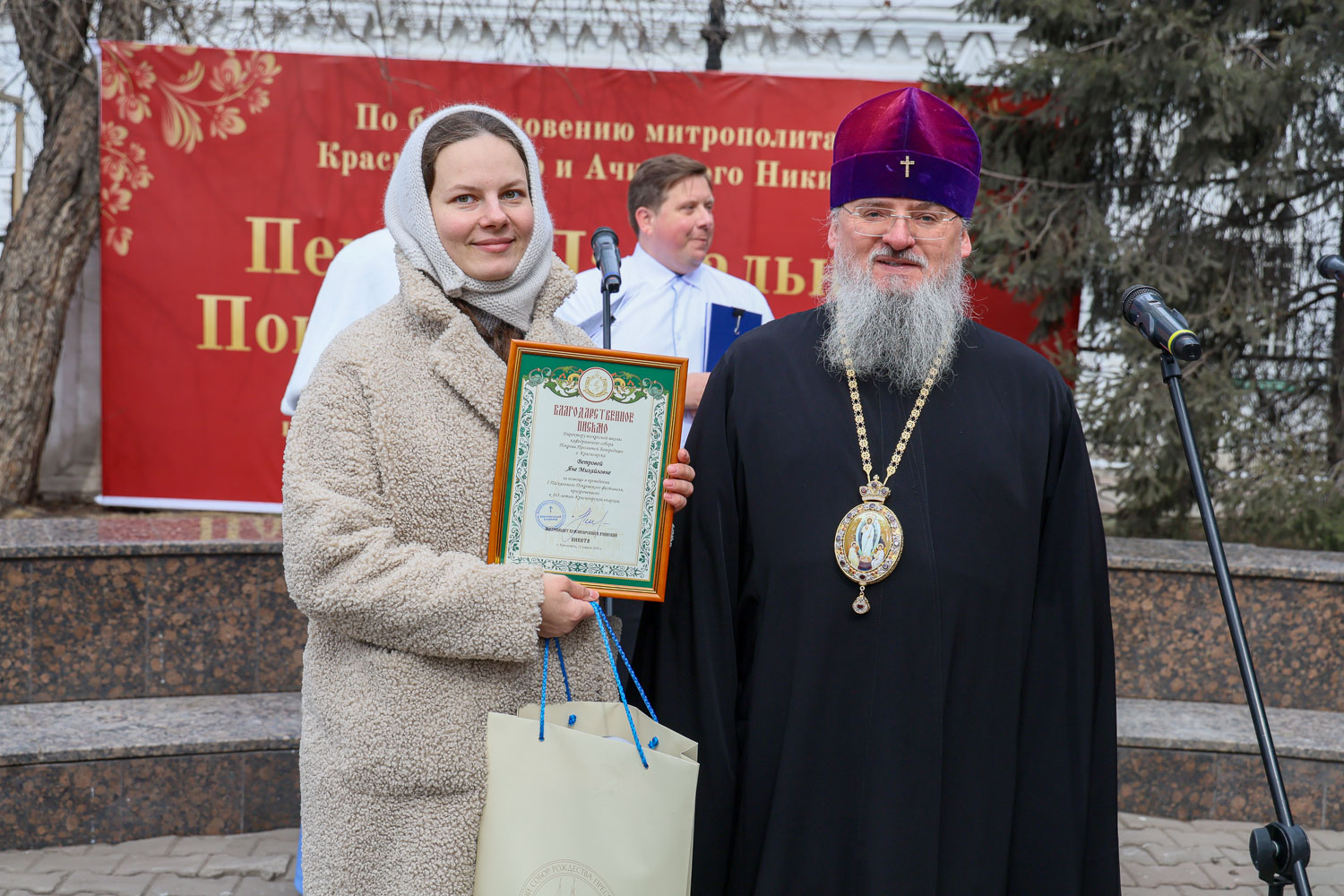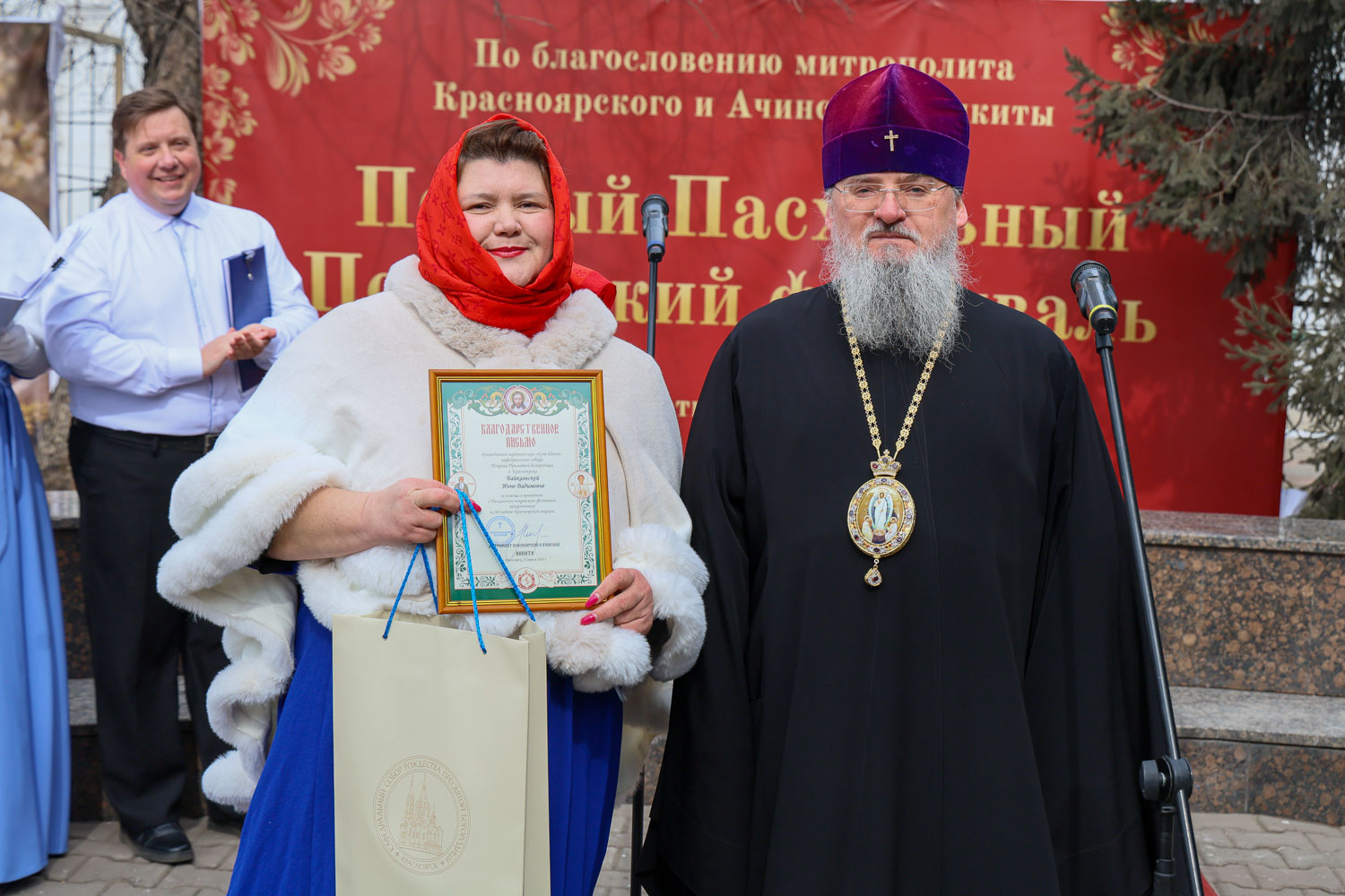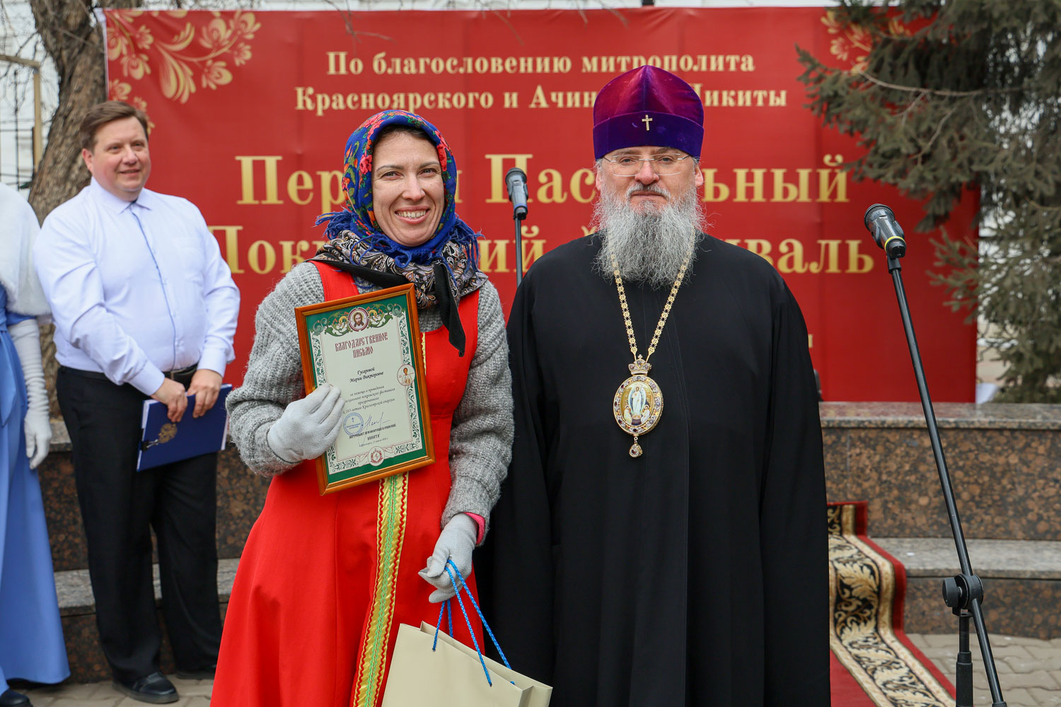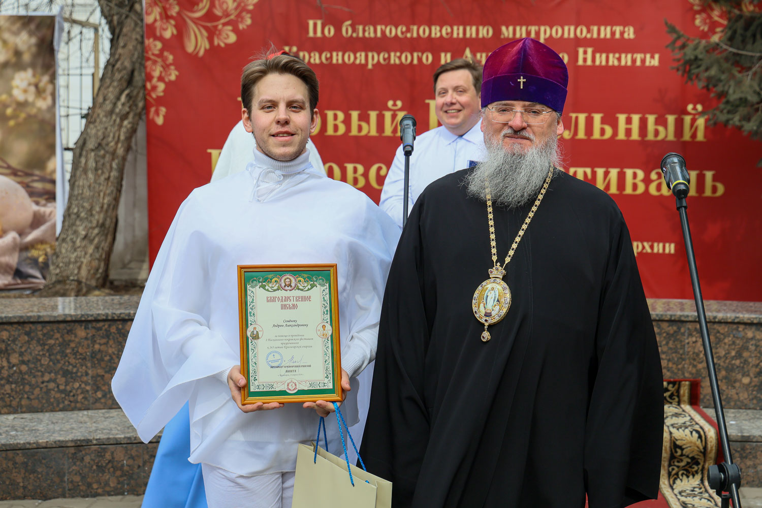 Митрополит Никита наградил архиерейскими грамотами за помощь в проведении фестиваля помощника настоятеля собора Сергея Старкова и директора современного экспериментального театра танца «Колибриант» Марину Котельникову-Какаулину. Благодарственные письма были вручены духовнику воскресной школы, штатному клирику собора иерею Александру Ветрову, руководителю народного хора «Kyrie Eleison» кафедрального собора Инне Байкальской, а также Марии Гусаровой, Марии Малетиной, Яне Ветровой и Андрею Семенову.