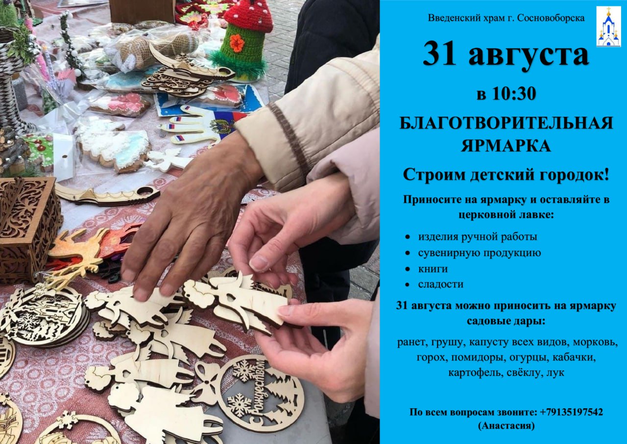 31 августа на территории церкви Введения Пресвятой Богородицы во храм города Сосновоборск проведут благотворительную ярмарку.