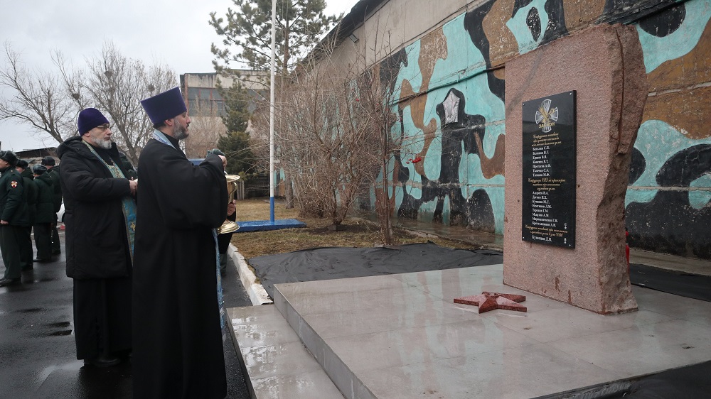 Священники совершили чин освящения мемориала, после чего присутствующие возложили цветы к стеле и почтили минутой молчания память погибших бойцов.