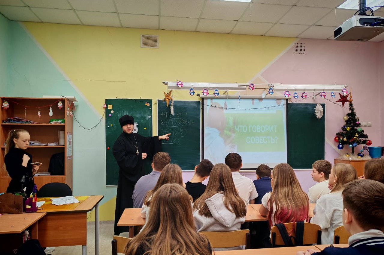 22 декабря штатный священник собора Архангела Михаила города Железногорска иерей Алексий Мещеряков посетил гимназию № 91, где рассказал школьникам о понятии совести в христианском мировоззрении.