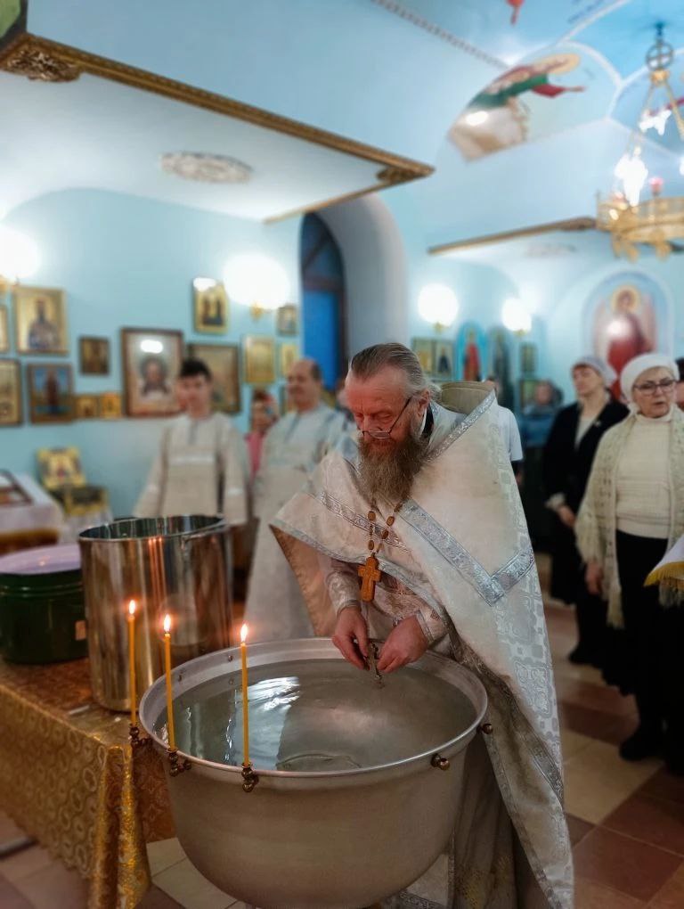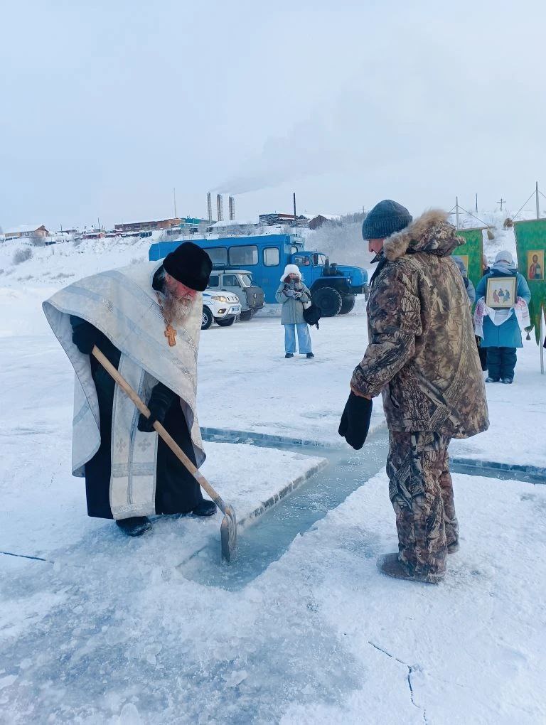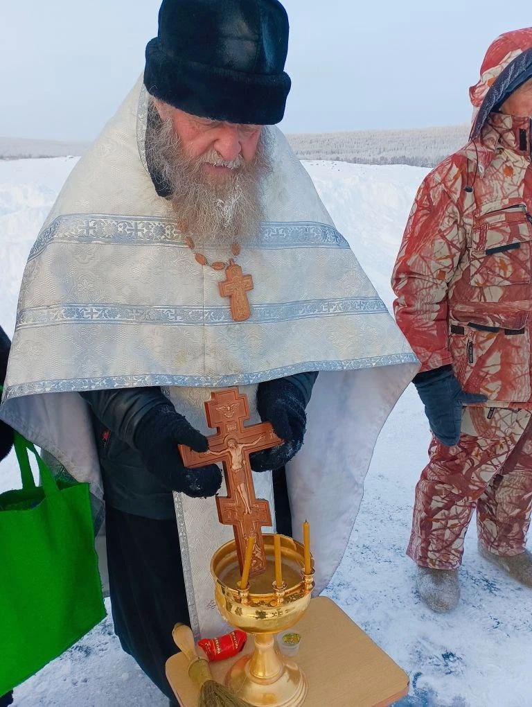По окончании Божественной литургии благочинный церквей Эвенкийского округа, настоятель храма Святой Троицы поселка Туры иерей Сергий Оржаховский совершил чин освящения воду и поздравил всех с праздником Крещения Господня.