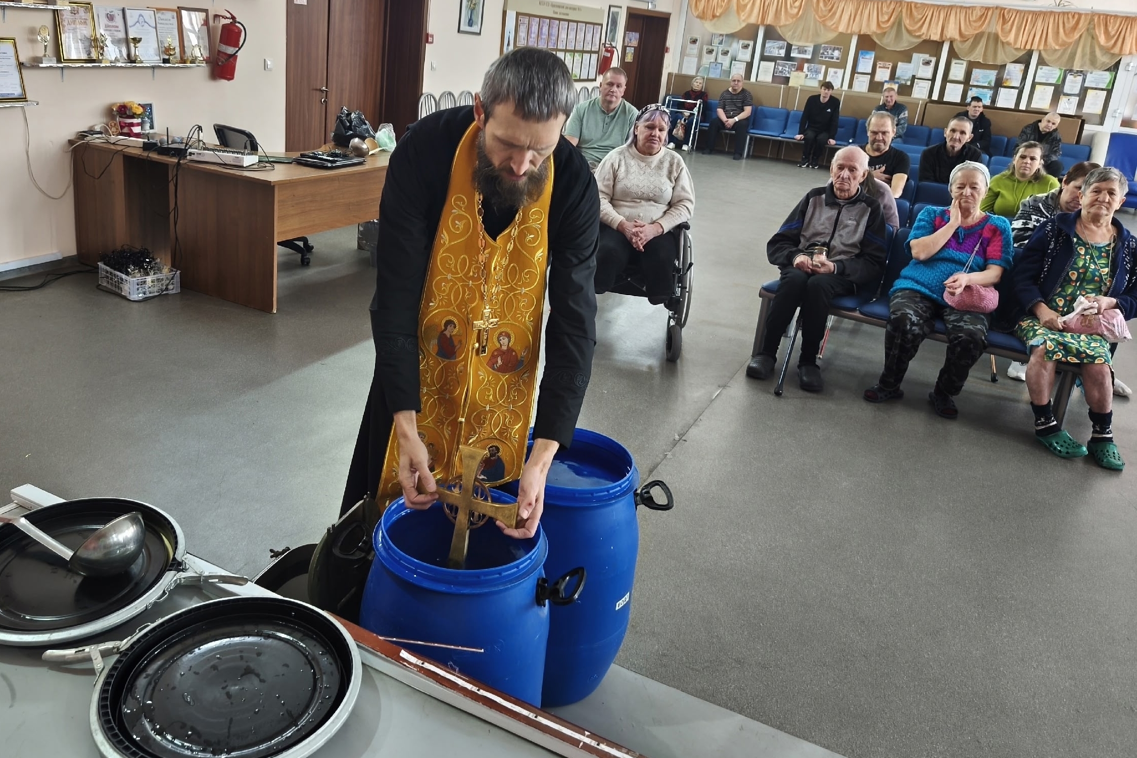 Отец Валерий совершил чин великого освящения воды, после чего окропил святой водой постояльцев и сотрудников социального учреждения.