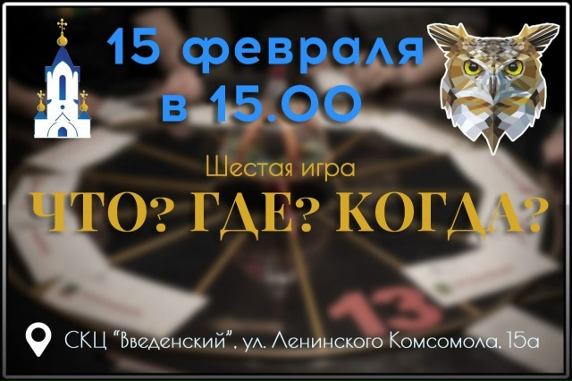 15 февраля в социально-культурном центре «Введенский» при церкви Введения во храм Пресвятой Богородицы города Сосновоборска состоится шестая интеллектуальная игра «Что? Где? Когда?». Мероприятие приурочено к 13-летию православного клуба «Встреча».