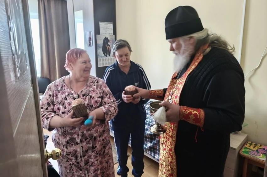 Отец Василий обратился к постояльцам с пастырским словом, поздравил с праздником Светлого Христова Воскресения и вручил пасхальные подарки.