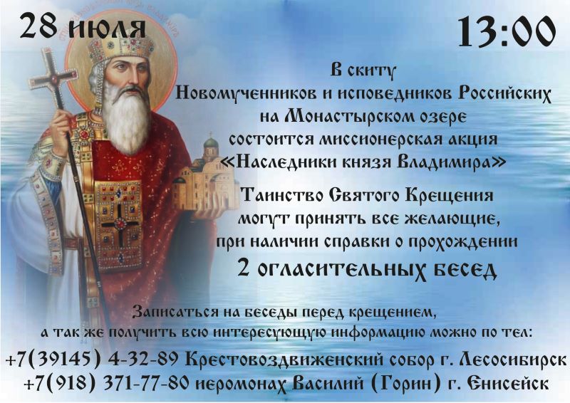 28 июля, в День Крещения Руси, на Монастырском озере в скиту Новомучеников и исповедников Российских пройдёт миссионерская акция «Наследники князя Владимира».