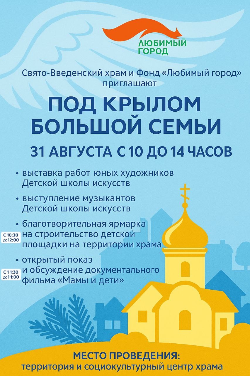 31 августа у православного социально-культурного центра «Введенский» для жителей Сосновоборска проведут фестиваль «Под крылом большой семьи».