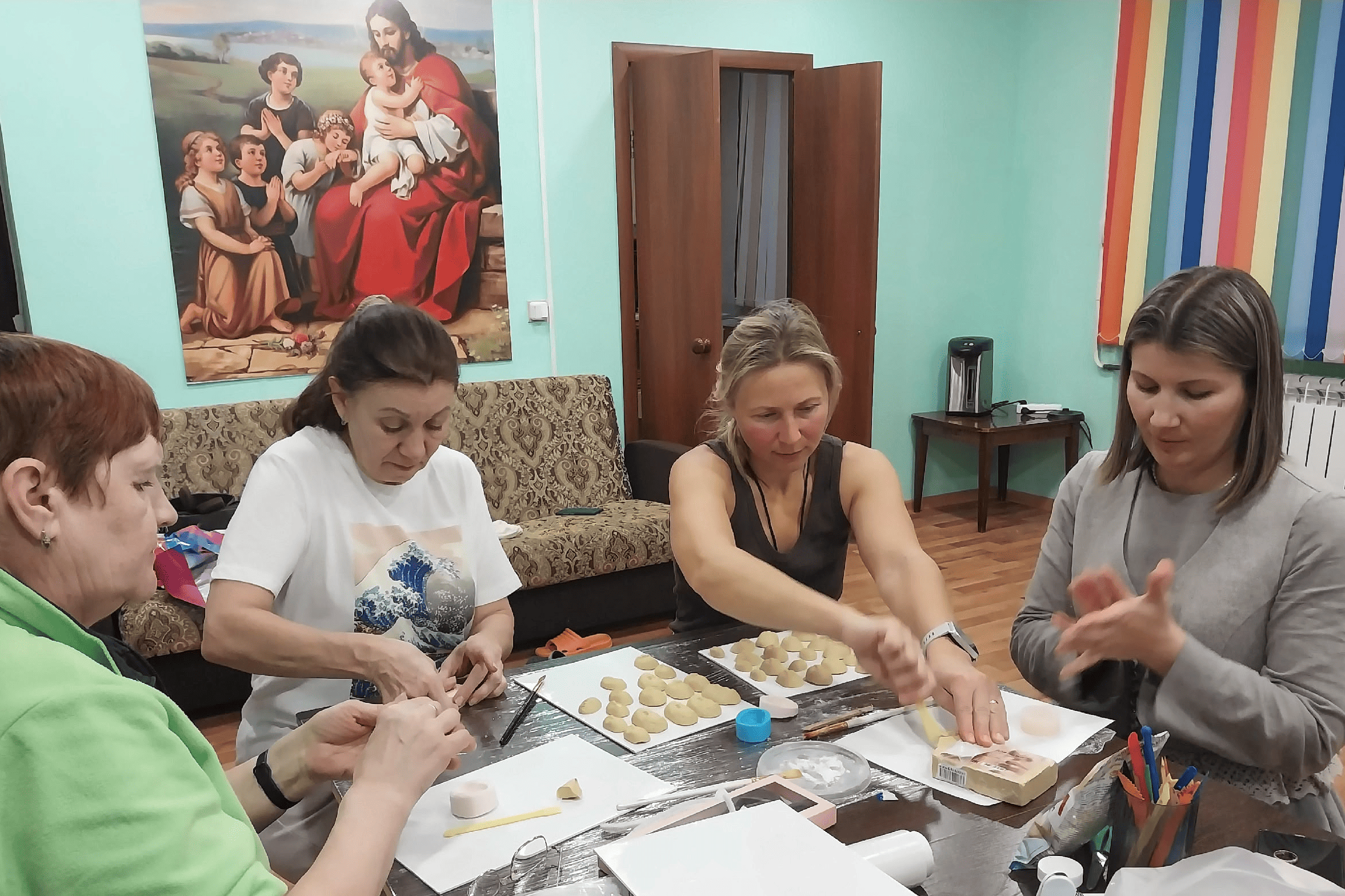 Под руководством Татьяны Яндовко, возглавляющей «Творческую мастерскую», мастерицы начали работу над изготовлением ангелочков и ватных игрушек, которые впоследствии будут использоваться для украшения храма и рождественских елей.