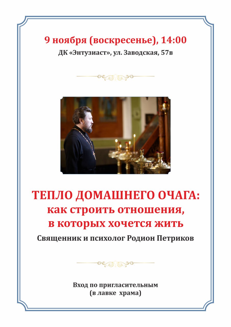 Перед собравшимися выступит благочинный тюремных храмов Красноярской митрополии, настоятель храма священномученика Амфилохия города Красноярска иерей Родион Петриков. В своей лекции священник расскажет о том, как сохранять добрые отношения между супругами и избегать недопониманий в семье.