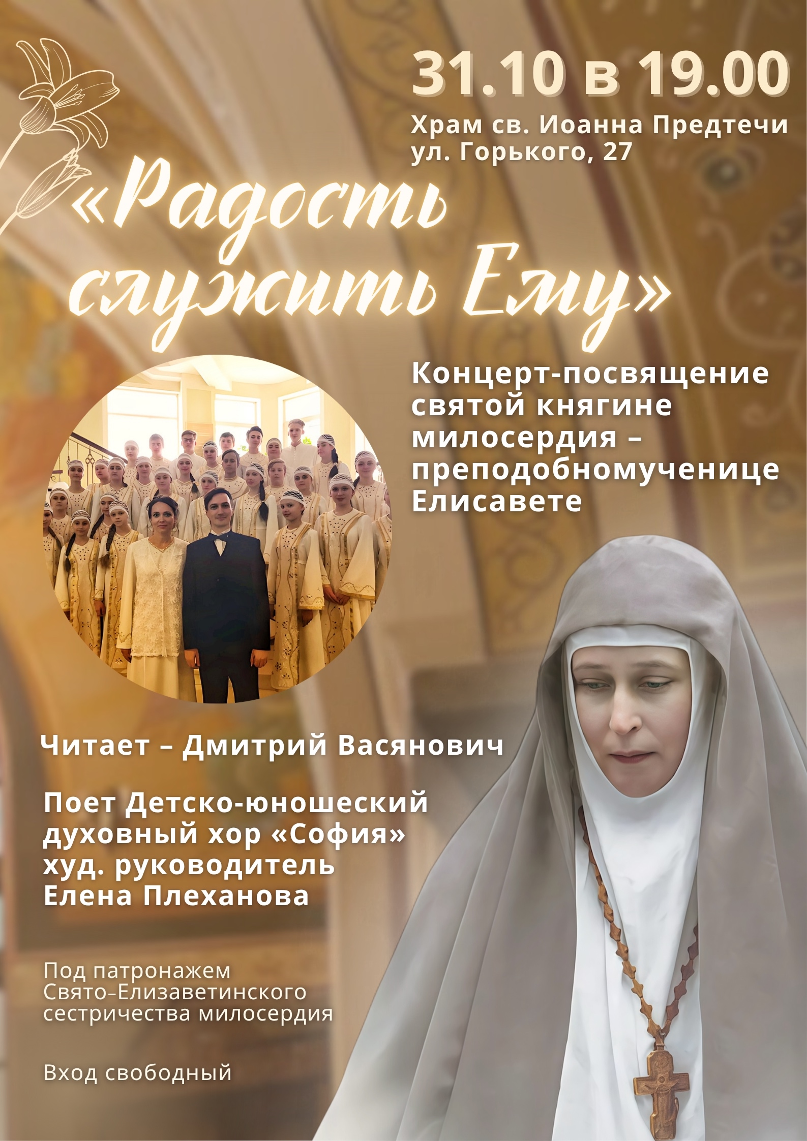 Программа мероприятия включает выступление детского духовного хора «София» под руководством Елены Плехановой. В исполнении заслуженного работника культуры, церковного регента Дмитрия Васяновича прозвучат фрагменты из духовного наследия великой княгини.