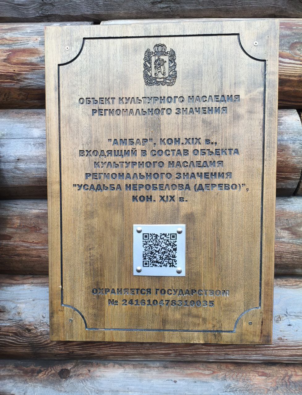 Информационная надпись содержит установленные законом сведения: категорию историко-культурного значения, наименование объекта, дату его постройки, слова «Охраняется государством» и регистрационный номер. Учитывая специфику памятника деревянного зодчества, табличка изготовлена из дерева и обработана профессиональными маслами для долговечности и органичного сочетания с фасадом. Для получения дополнительной информации на табличке размещен QR-код.