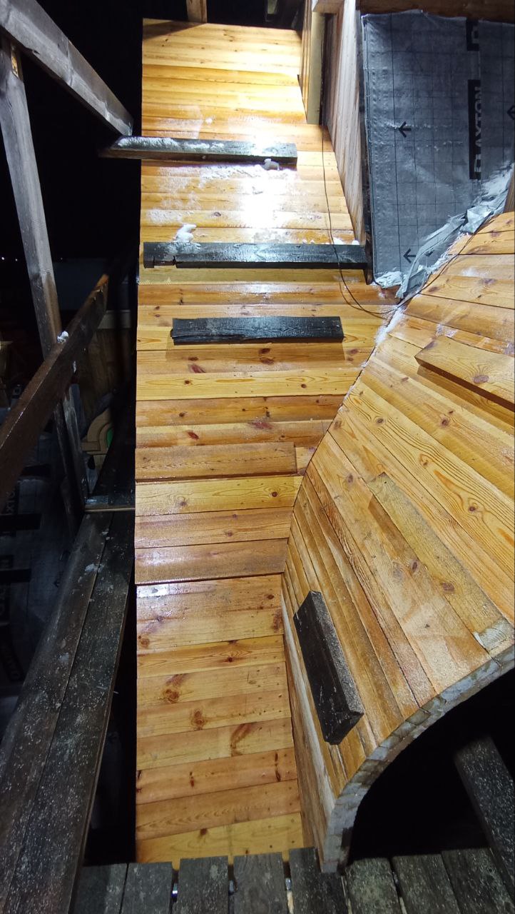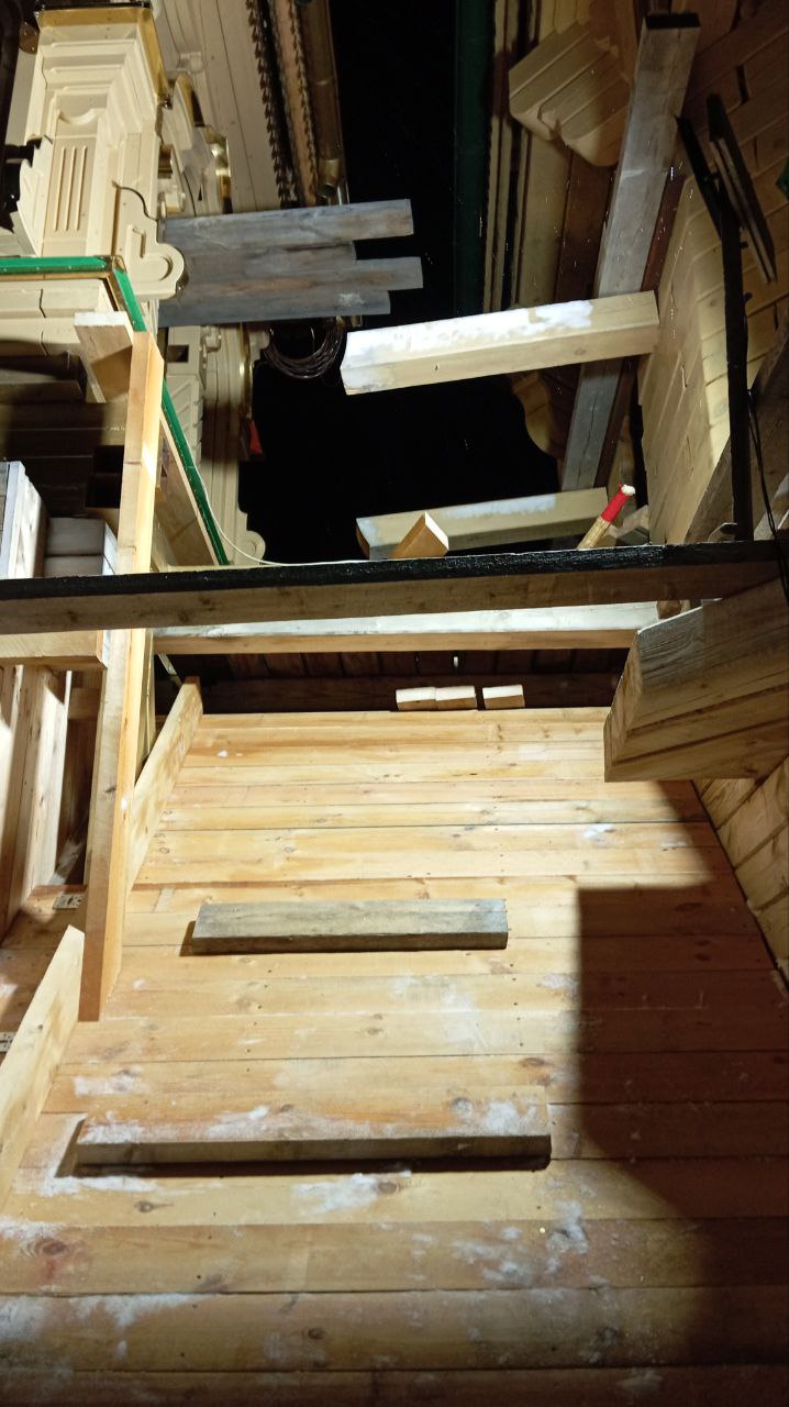 В морозные дни рабочие переходят в столярную мастерскую, где занимаются обработкой древесины, созданием декоративных элементов и подготовкой деталей для контрфорсов. Все заготовки проходят тщательную фрезеровку для последующей сборки. С наступлением потепления бригада возвращается к монтажным работам непосредственно на строительной площадке.