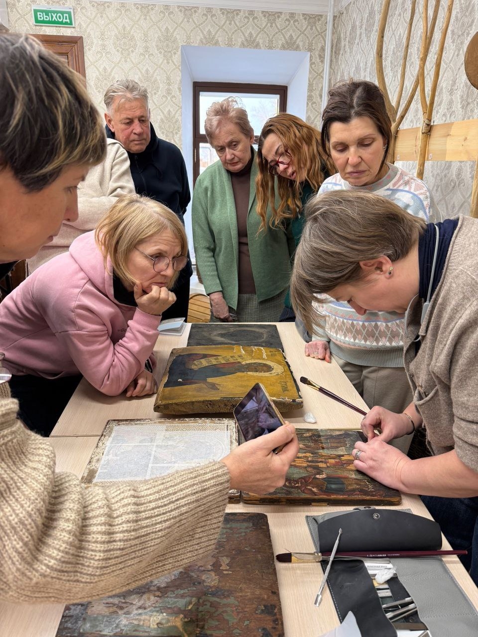 Программа также включала посещение усадебного комплекса Баландина и мастер-класс по реставрации икон, который провела реставратор музея Анастасия Викторовна Сычевник. Участники увидели процесс профилактической заклейки, узнали о сложностях, возникающих при восстановлении икон, и получили ответы на профессиональные вопросы.