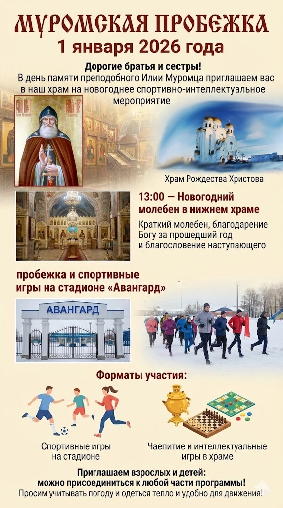 Храм Рождества Христова в Красноярске приглашает 1 января 2026 года в день памяти преподобного Илии Муромца желающих присоединиться к новогоднему спортивно-интеллектуальному мероприятию «Муромская пробежка».
