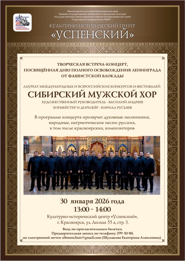 30 января в Культурно-историческом центре «Успенский» города Красноярска состоится творческая встреча-концерт Сибирского мужского хора, посвящённая дню полного освобождения Ленинграда от фашистской блокады.