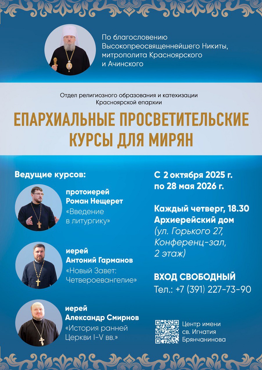 По благословению митрополита Красноярского и Ачинского Никиты в Красноярской епархии продолжается цикл просветительских курсов для мирян 2025–2026 года. Курсы продлятся до 28 мая.