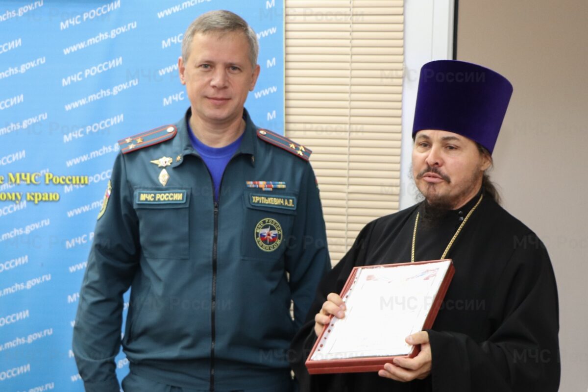 3 октября в рамках торжественного мероприятия, посвящённого 93-й годовщине со дня образования гражданской обороны, в селекторном зале Главного управления МЧС России по Красноярскому краю состоялась церемония награждения. Настоятель храма святителя Луки (Войно-Ясенецкого) при Красноярском государственном медицинском университете протоиерей Анатолий Обухов был награждён благодарственным письмом за плодотворное сотрудничество с МЧС России